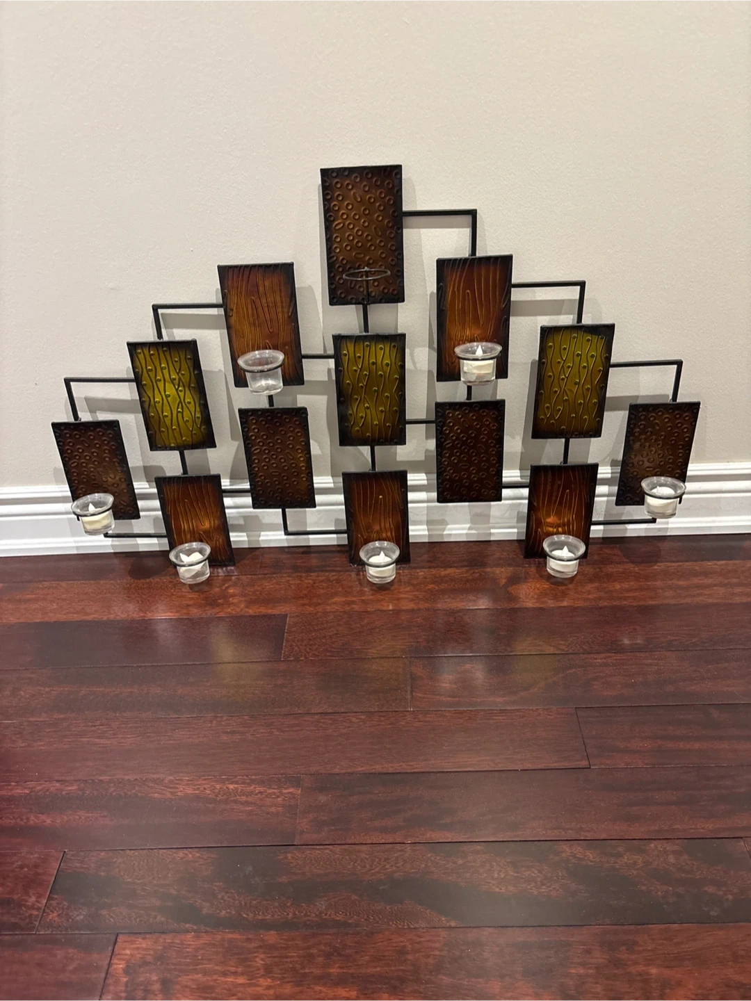 This wall sconce holds 8 tealight candles. It features a tiered design with a mix of textured and wood-grain finishes. The metal construction ensures durability for long-lasting display.