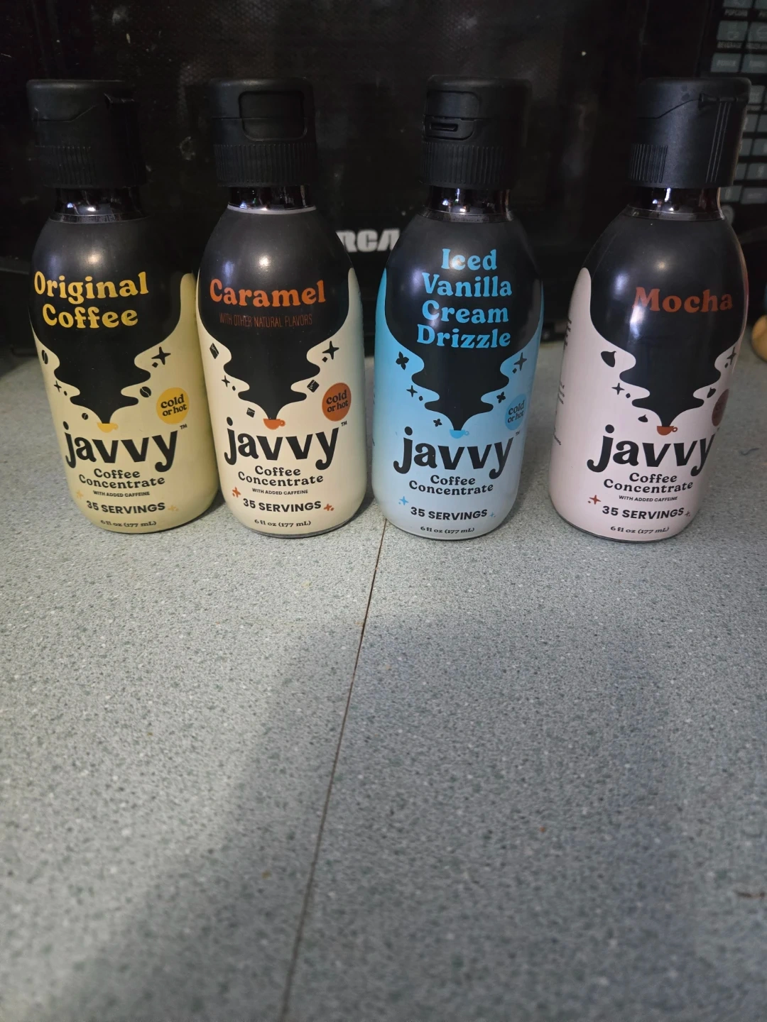 Javy Coffee Concentrate with four flavours: Original Coffee, Caramel, Iced Vanilla Cream Drizzle, and Mocha. Each bottle contains 6 fl oz (177 mL) and offers 35 servings. It's cold or hot, with added caffeine. These concentrates are great for quick and easy coffee preparation. Price is per bottle