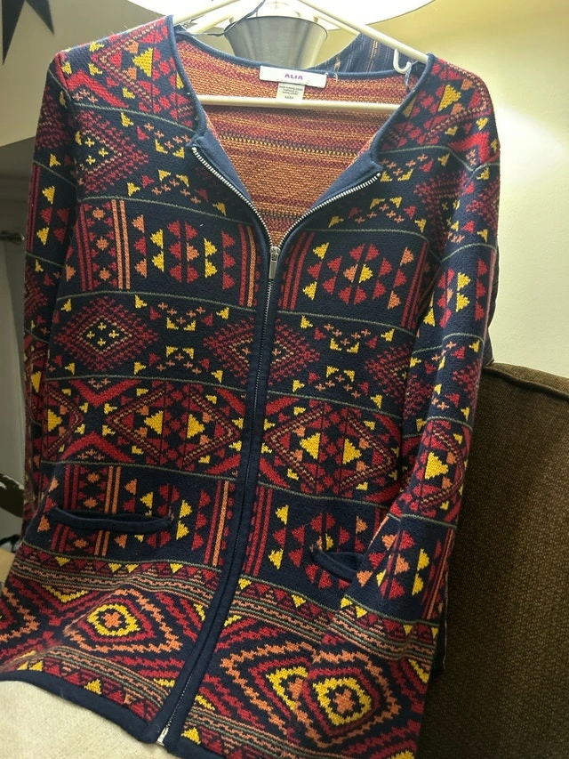 Alia zip-up cardigan in size medium, featuring a unique geometric pattern with navy, red, and yellow colours. It's a stylish and cozy piece, perfect for layering during cooler weather. Size: M, Brand: Alia, Closure: Zipper, Pattern: Geometric. Smoke free environment. Pick up in Everett or possible delivery to North and Barrie.