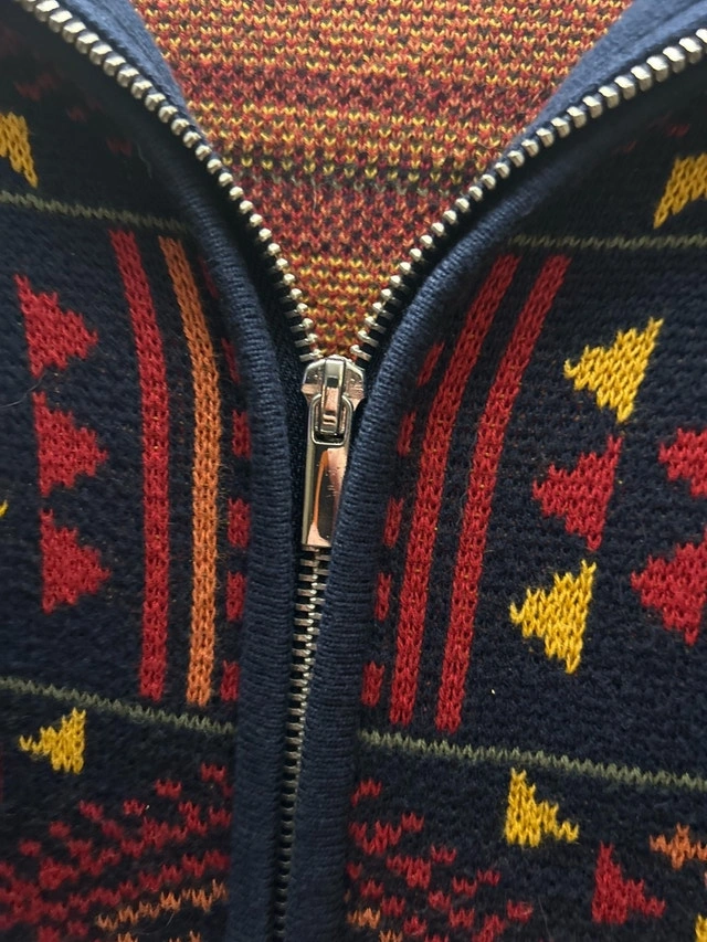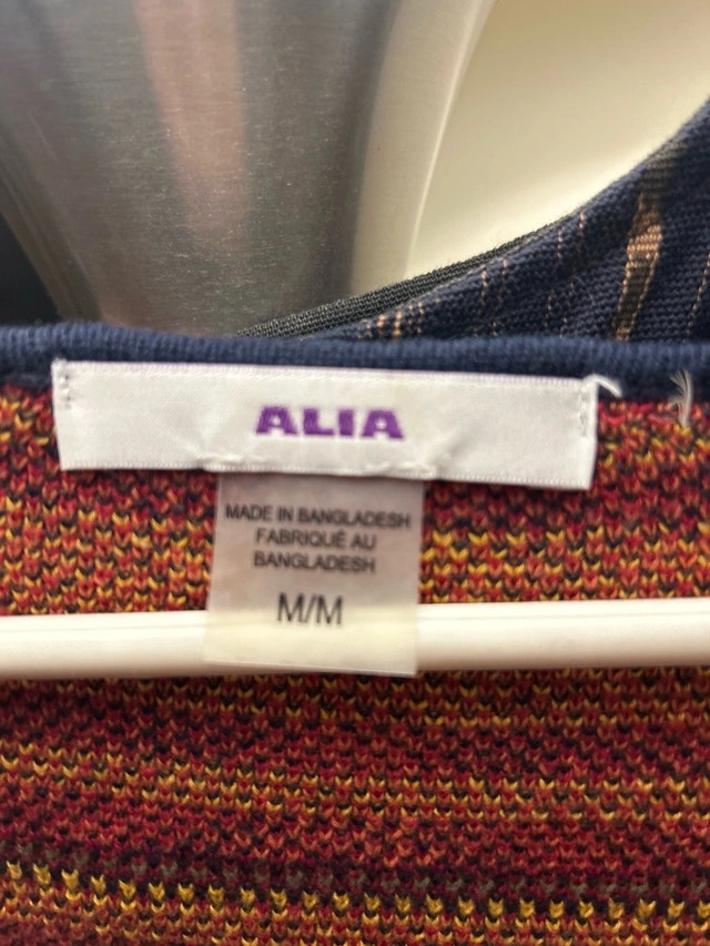 Alia zip-up cardigan in size medium, featuring a unique geometric pattern with navy, red, and yellow colours. It's a stylish and cozy piece, perfect for layering during cooler weather. Size: M, Brand: Alia, Closure: Zipper, Pattern: Geometric. Smoke free environment. Pick up in Everett or possible delivery to North and Barrie.