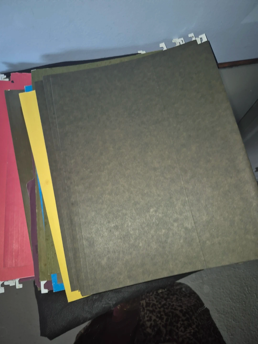 A collection of assorted hanging file folders. Includes a variety of colours. These folders are great for organizing documents in filing cabinets.