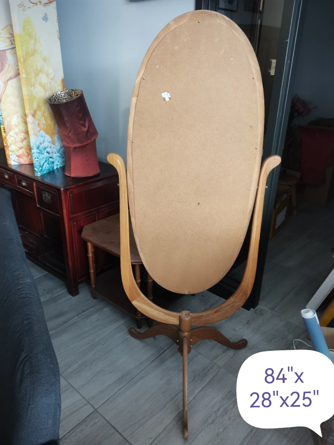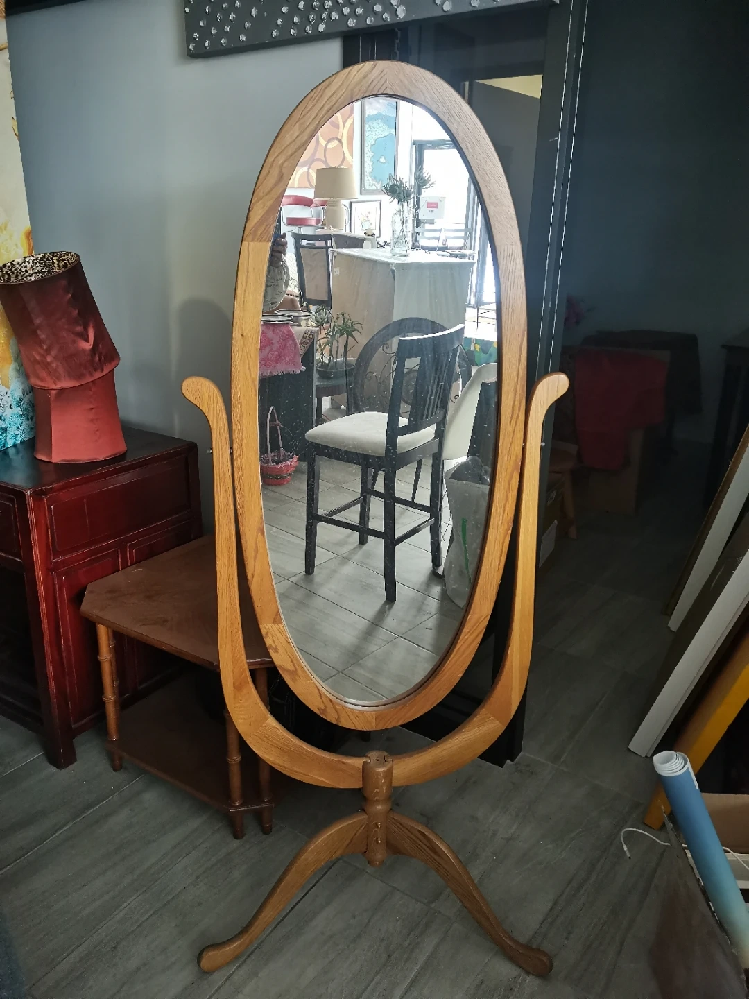 Enhance your living space with this elegant, used oak-framed standing mirror, perfect for adding a touch of classic charm to any room, measuring 84" tall and 28" wide. This mirror is in good condition and ready to bring light and style to your home.