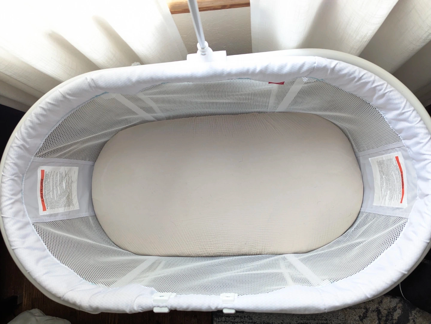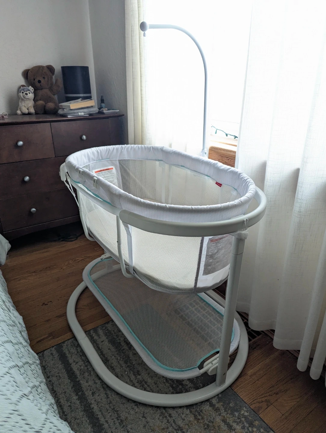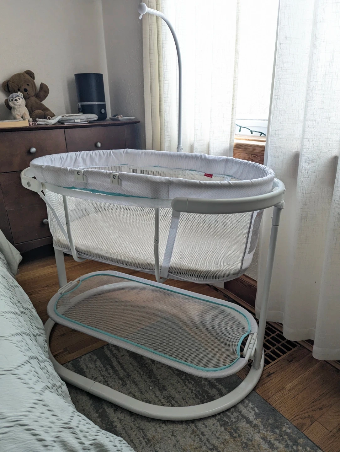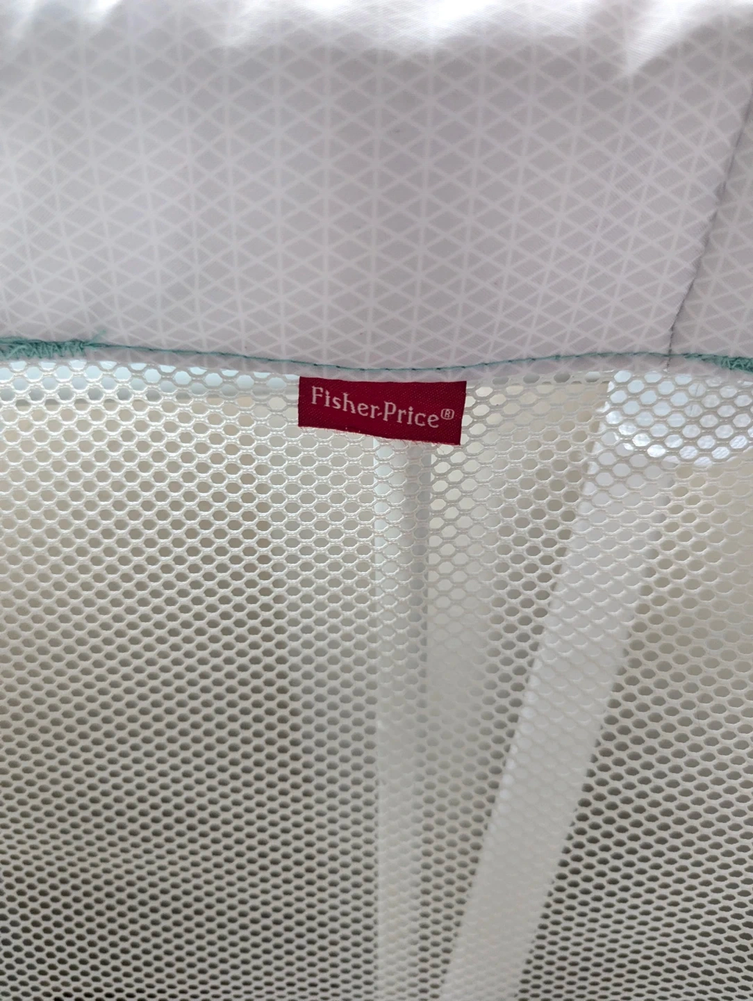 This is a Fisher-Price bassinet. It has mesh sides for airflow and a supportive mattress. A lower storage shelf is included.