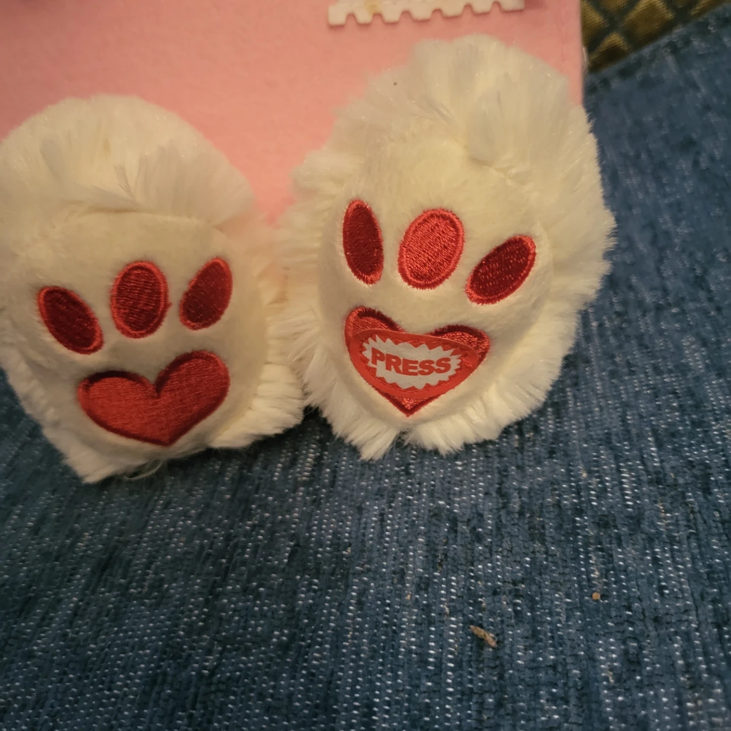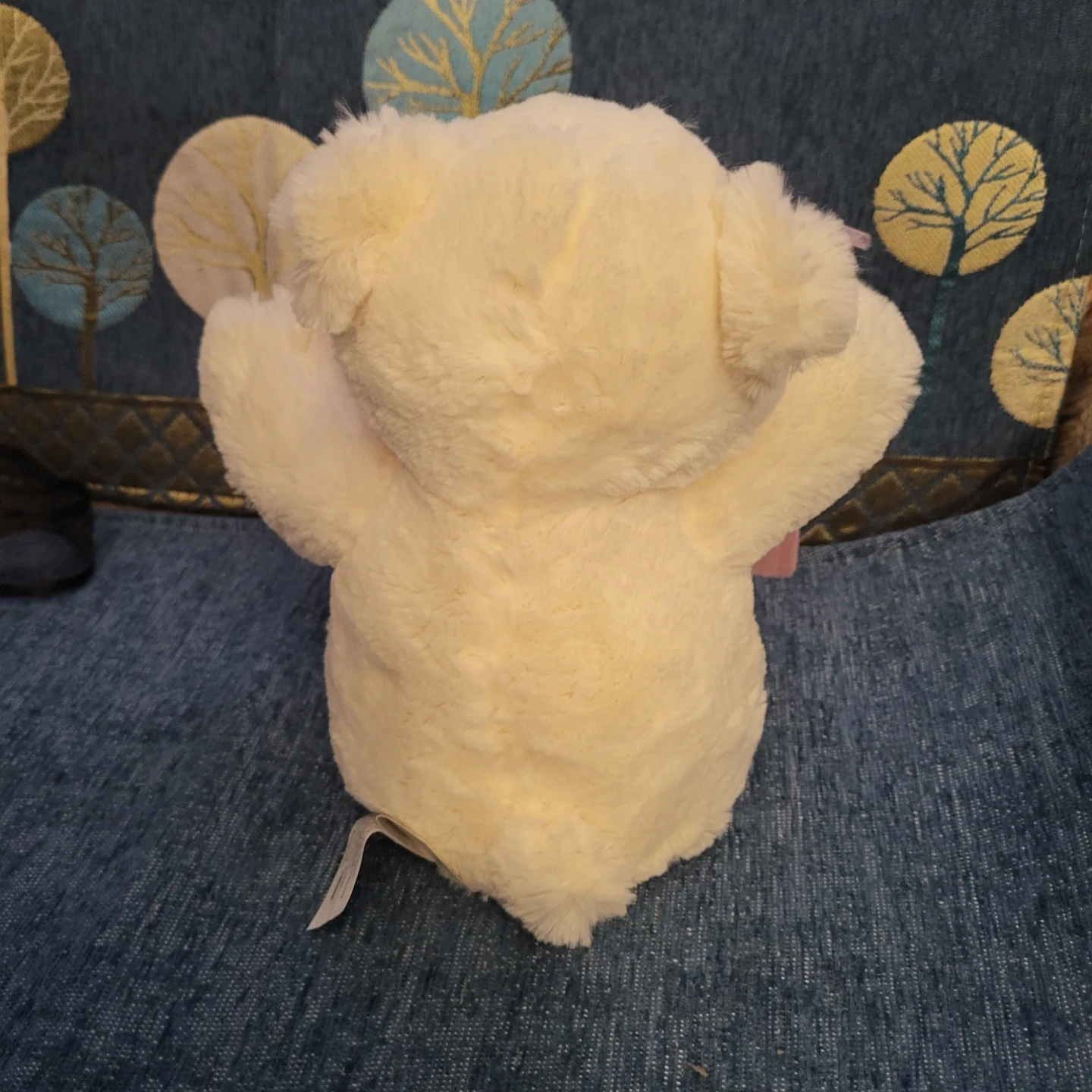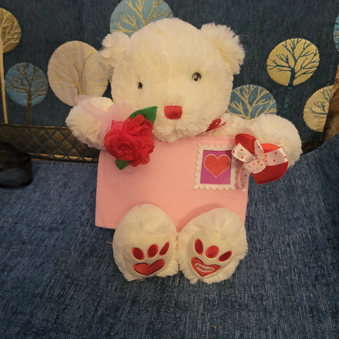A plush teddy bear dressed for Valentine's Day, holding a red rose and a pink envelope. It's white with red accents on its paws. Squeeze its paw to hear it talk!