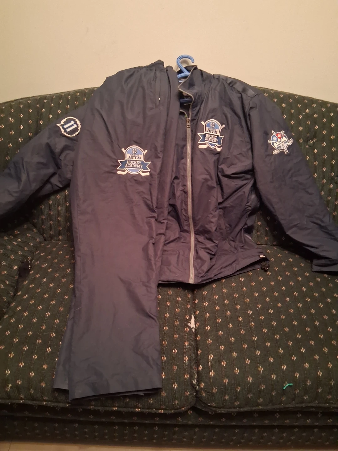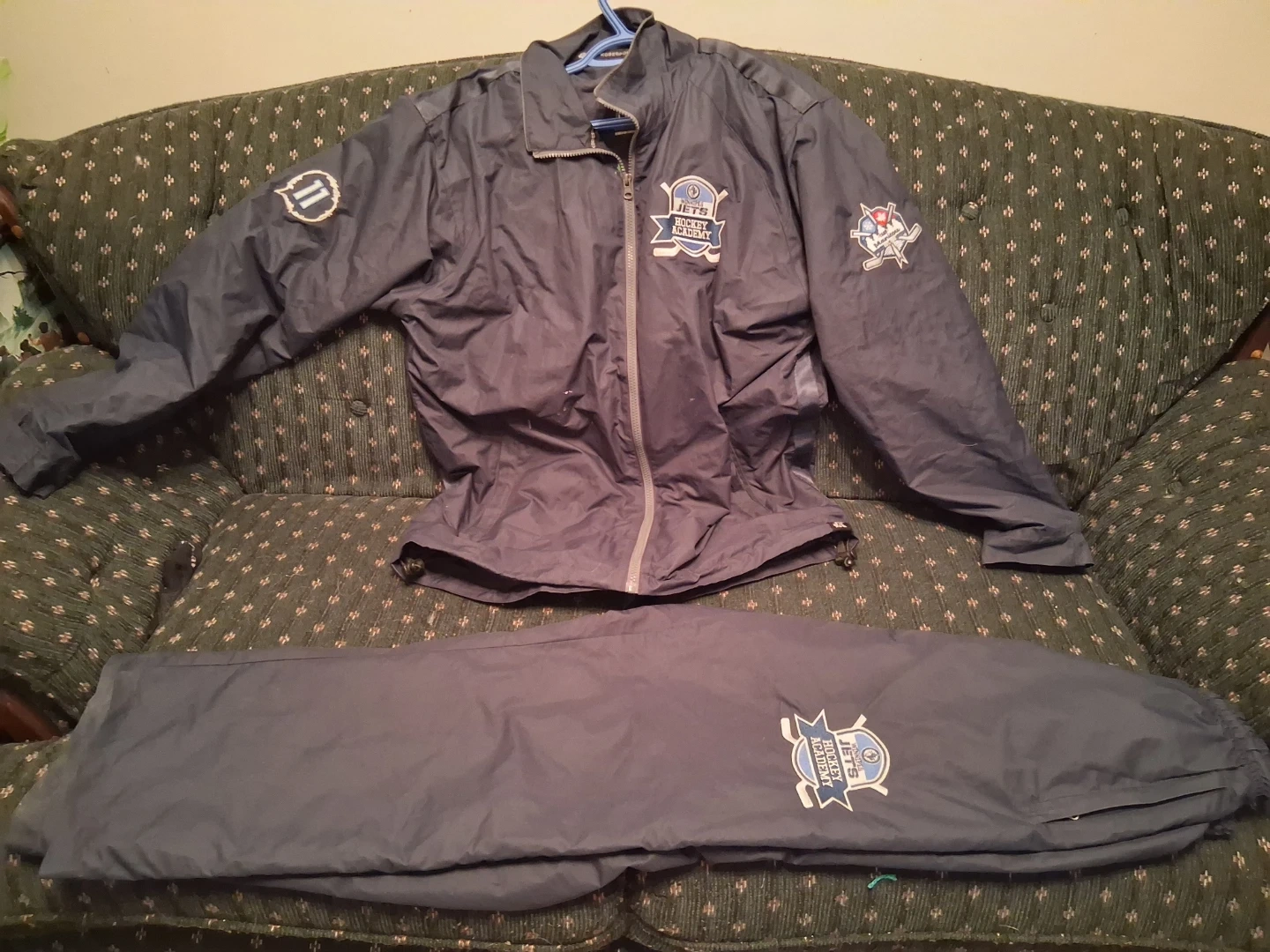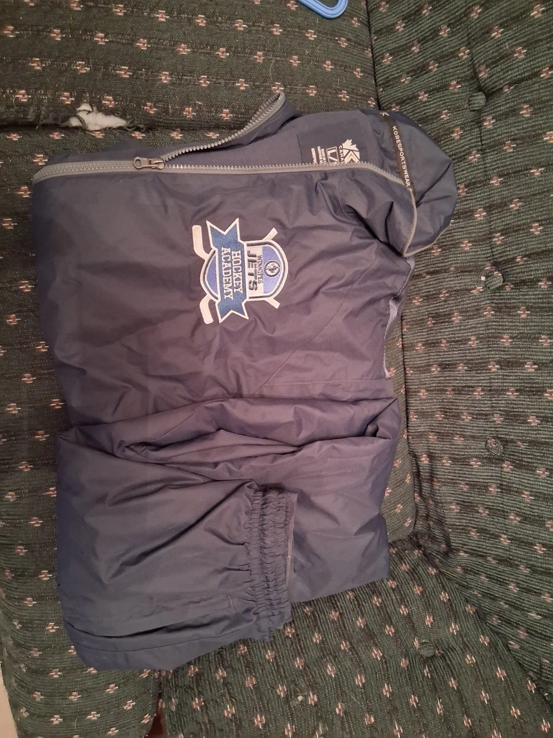This is a two-piece tracksuit set featuring the Winnipeg Jets Hockey Academy logo. It's made by Kobe Sportswear and comes in a size large. The set includes a jacket and pants, perfect for any young hockey player.