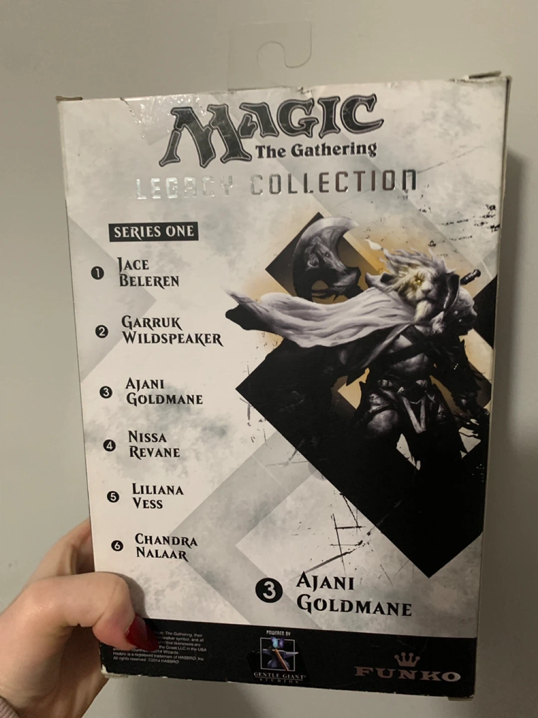This is the Ajani Goldmane action figure from Magic The Gathering's Legacy Collection. It's part of Series One and is recommended for ages 14 and up. The figure comes in its original packaging, showing its detailed design and accessories.