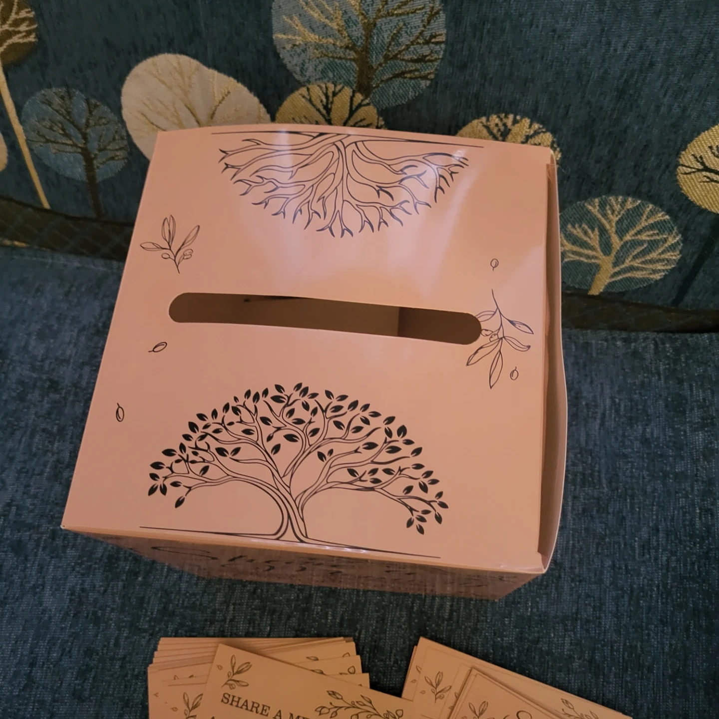 This memory box is designed for weddings or special events. It includes a box with a slot and cards for guests to share memories or words of love. The box has a decorative tree design and comes with pre-printed cards. It's a lovely way to collect heartfelt messages!