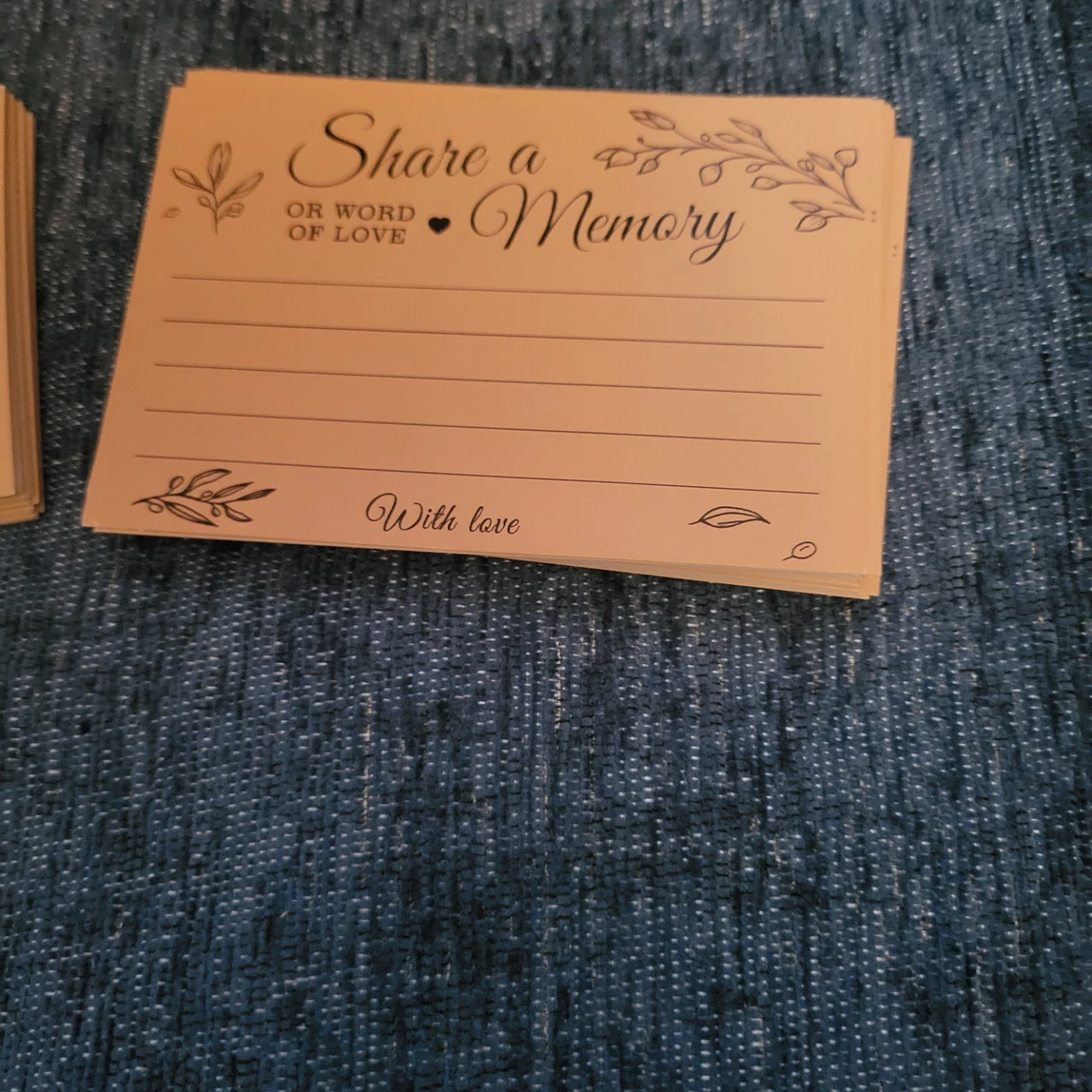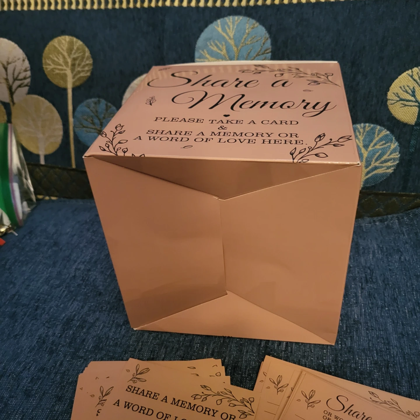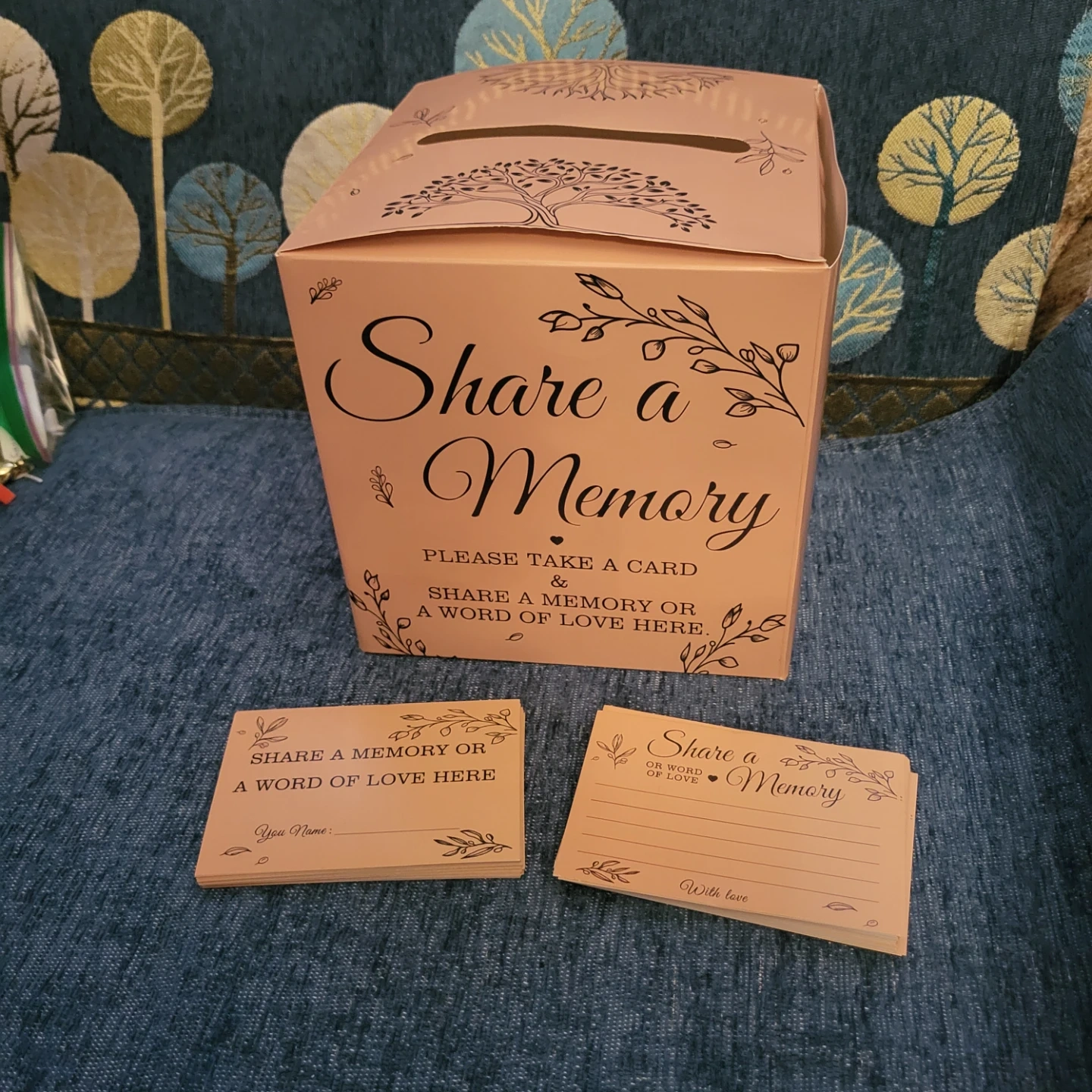 This memory box is designed for weddings or special events. It includes a box with a slot and cards for guests to share memories or words of love. The box has a decorative tree design and comes with pre-printed cards. It's a lovely way to collect heartfelt messages!