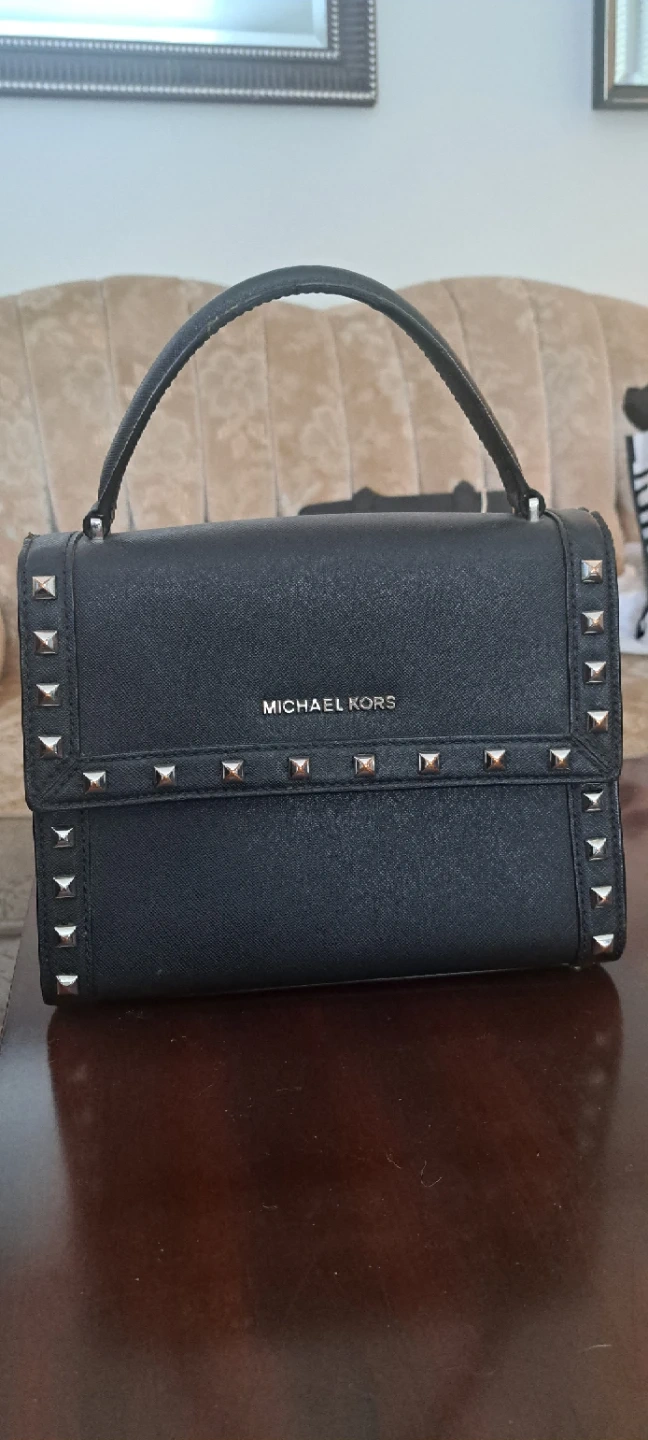 Stylish black leather handbag with silver stud detailing from Michael Kors. It features a top handle and a secure closure. This bag's material is leather.