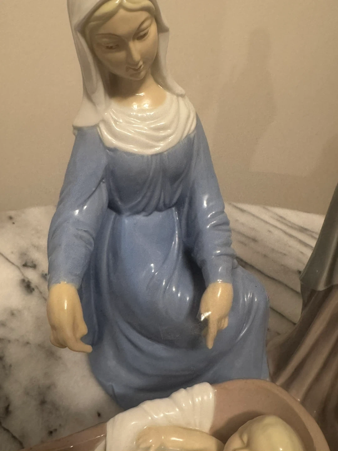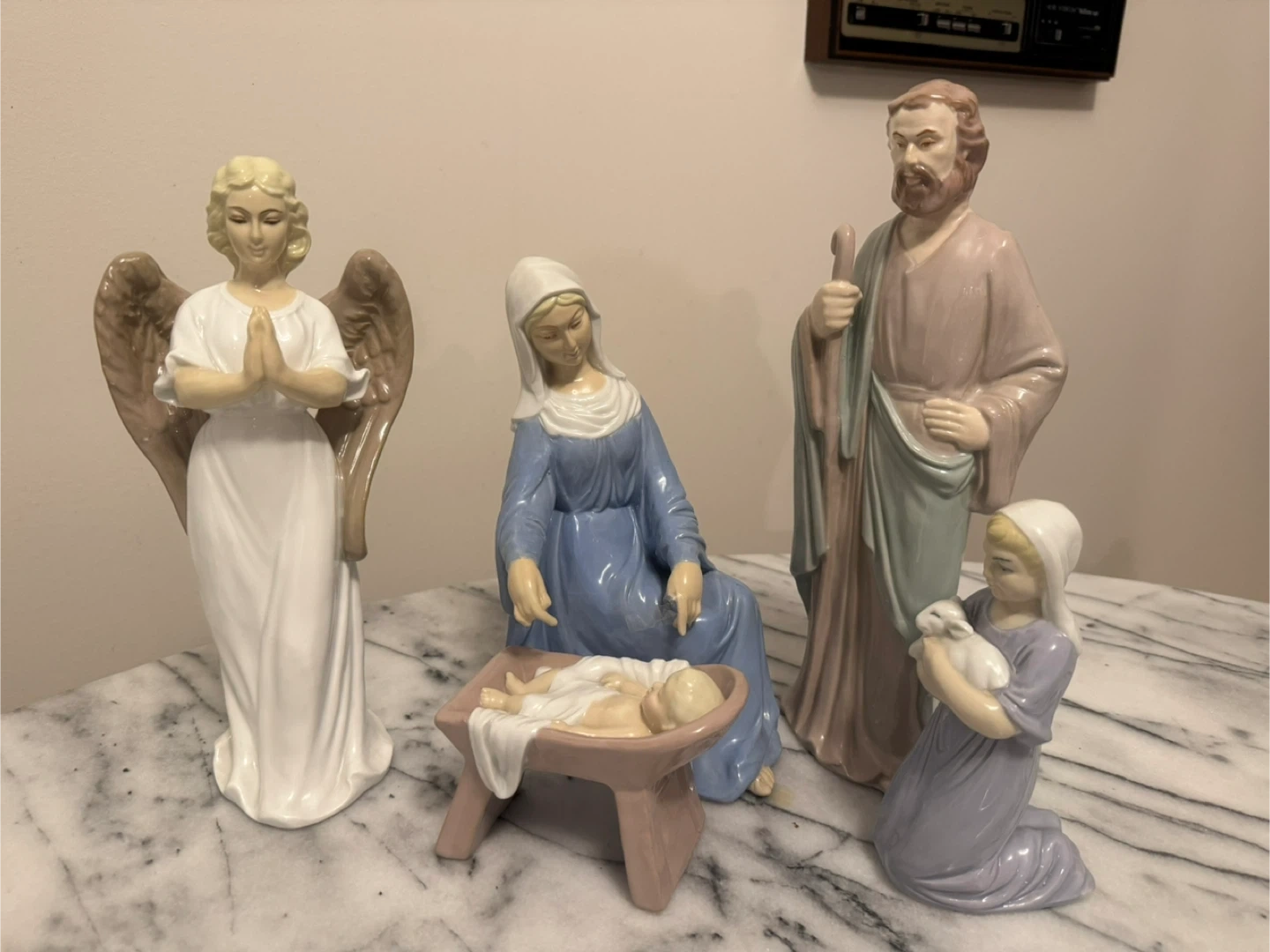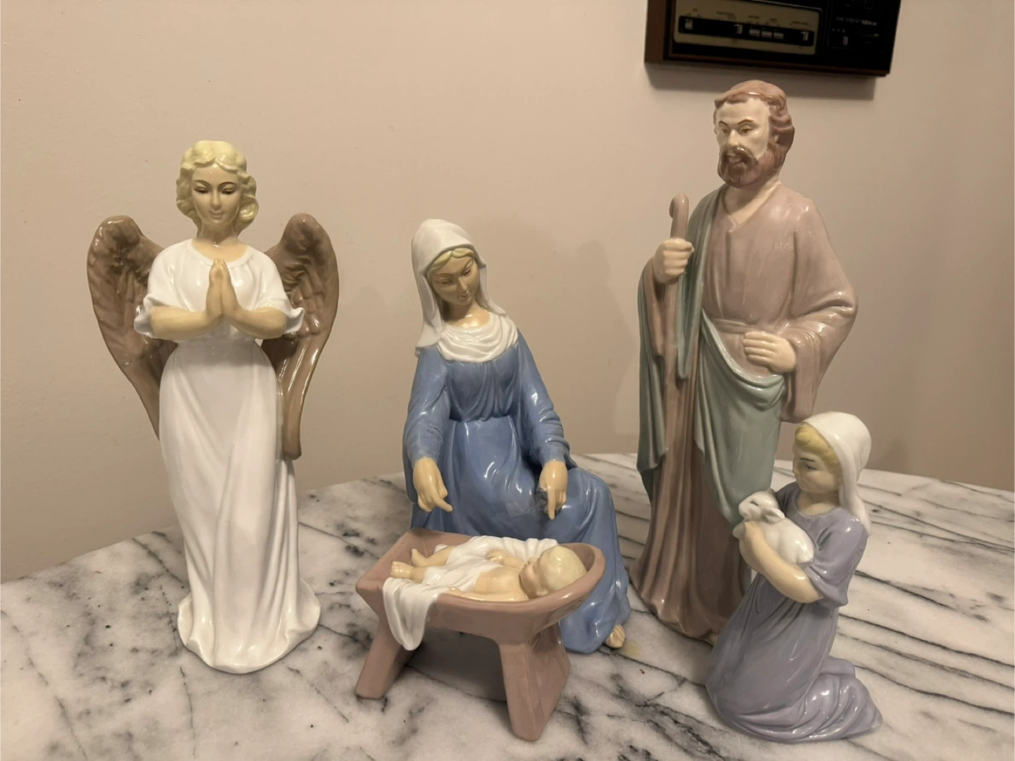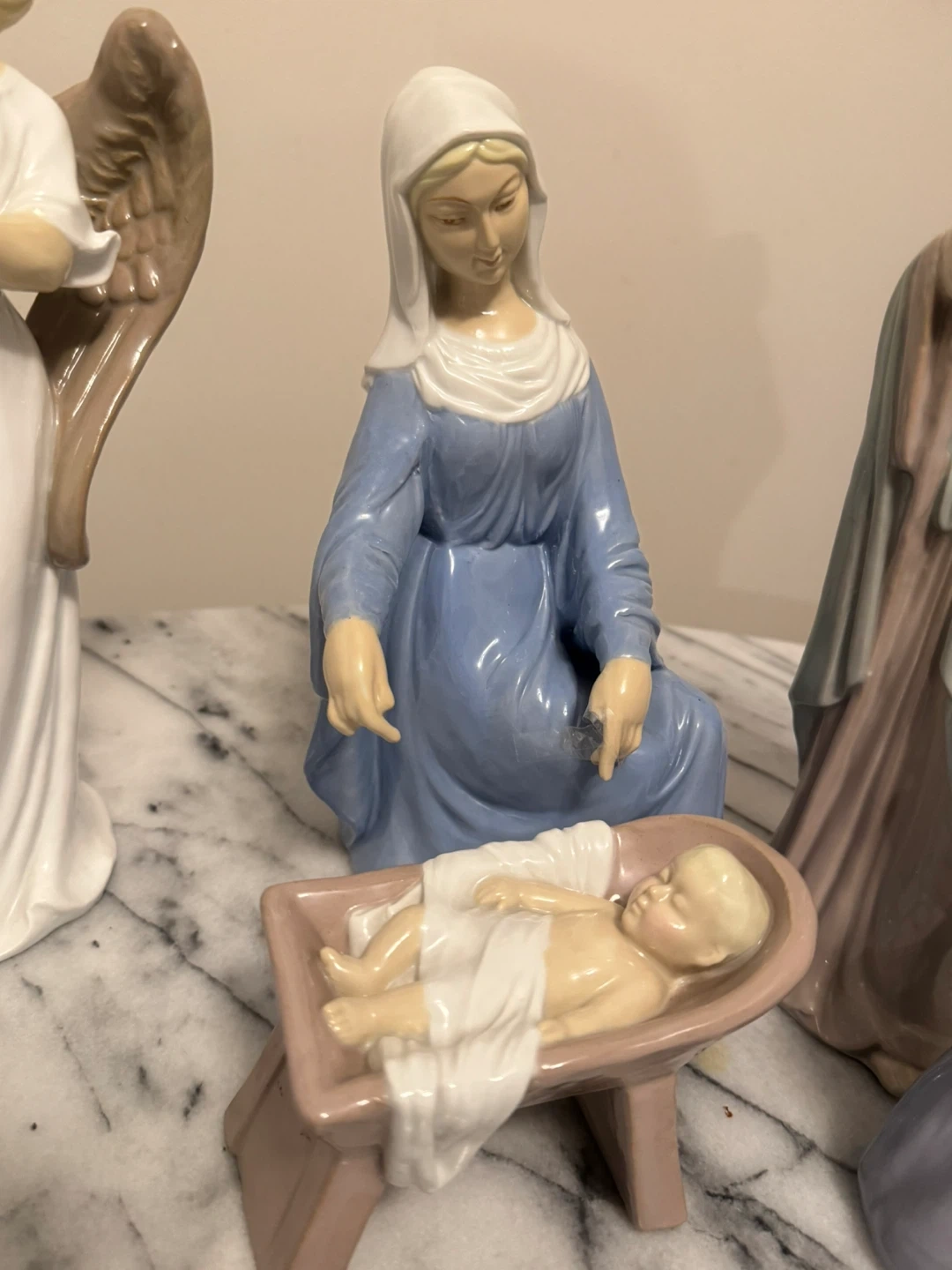 This is a set of four porcelain nativity figurines. It includes Mary, Joseph, Baby Jesus in a manger, and an angel. Perfect for your holiday display!