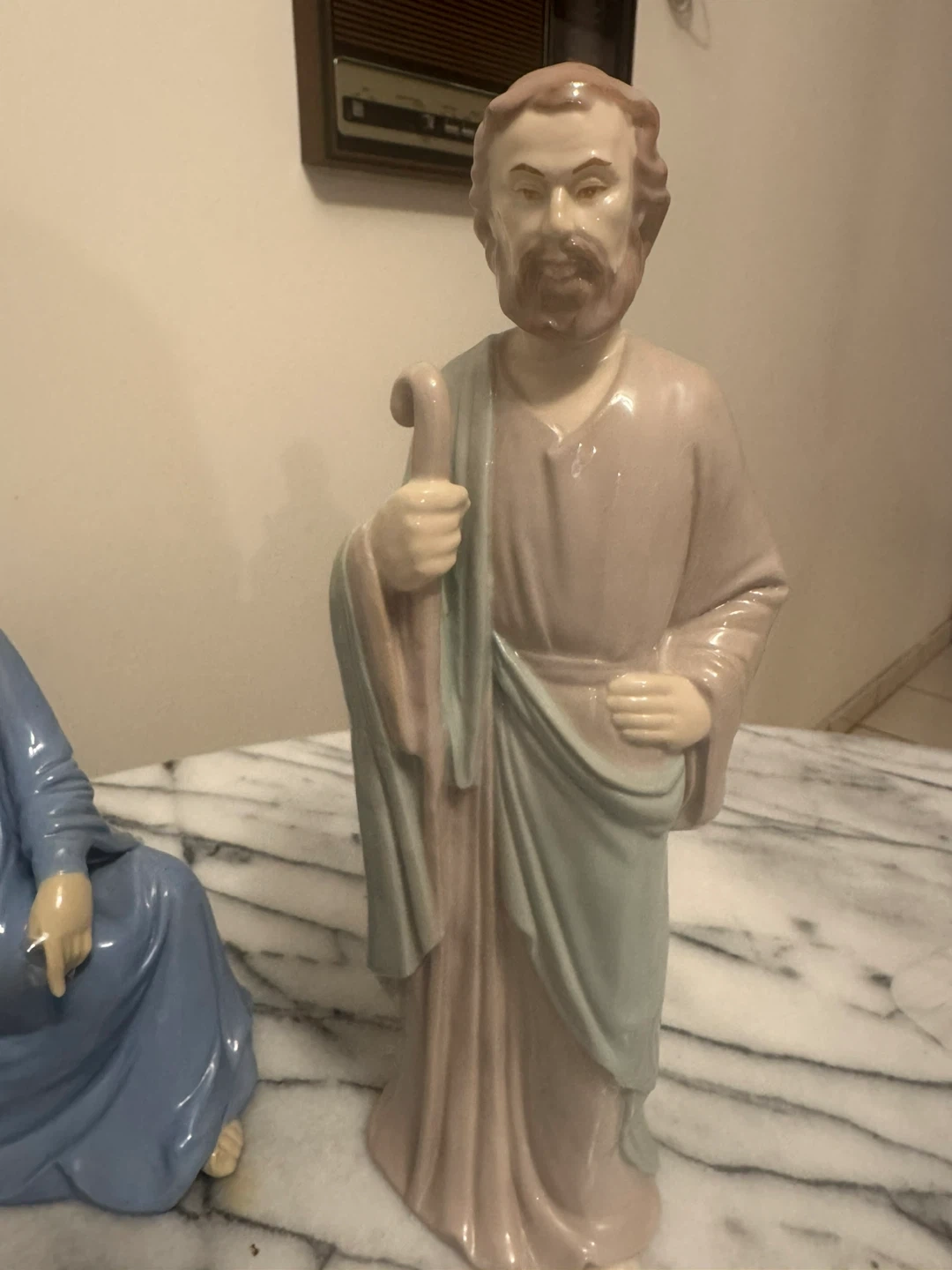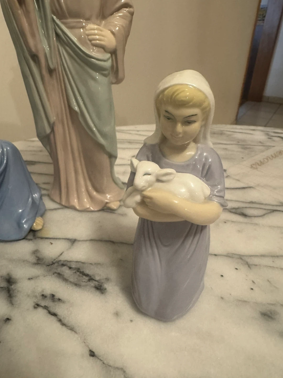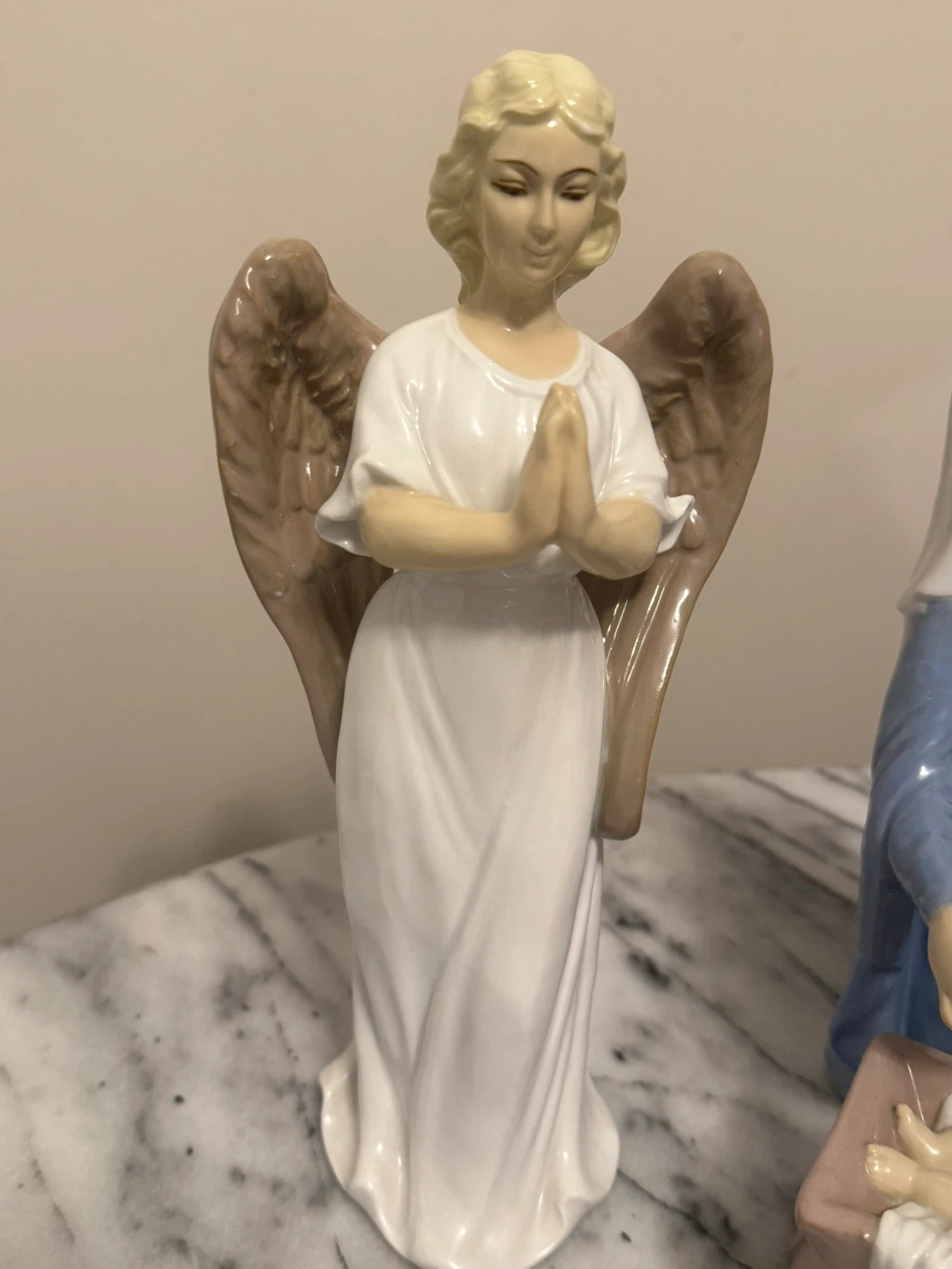 This is a set of four porcelain nativity figurines. It includes Mary, Joseph, Baby Jesus in a manger, and an angel. Perfect for your holiday display!