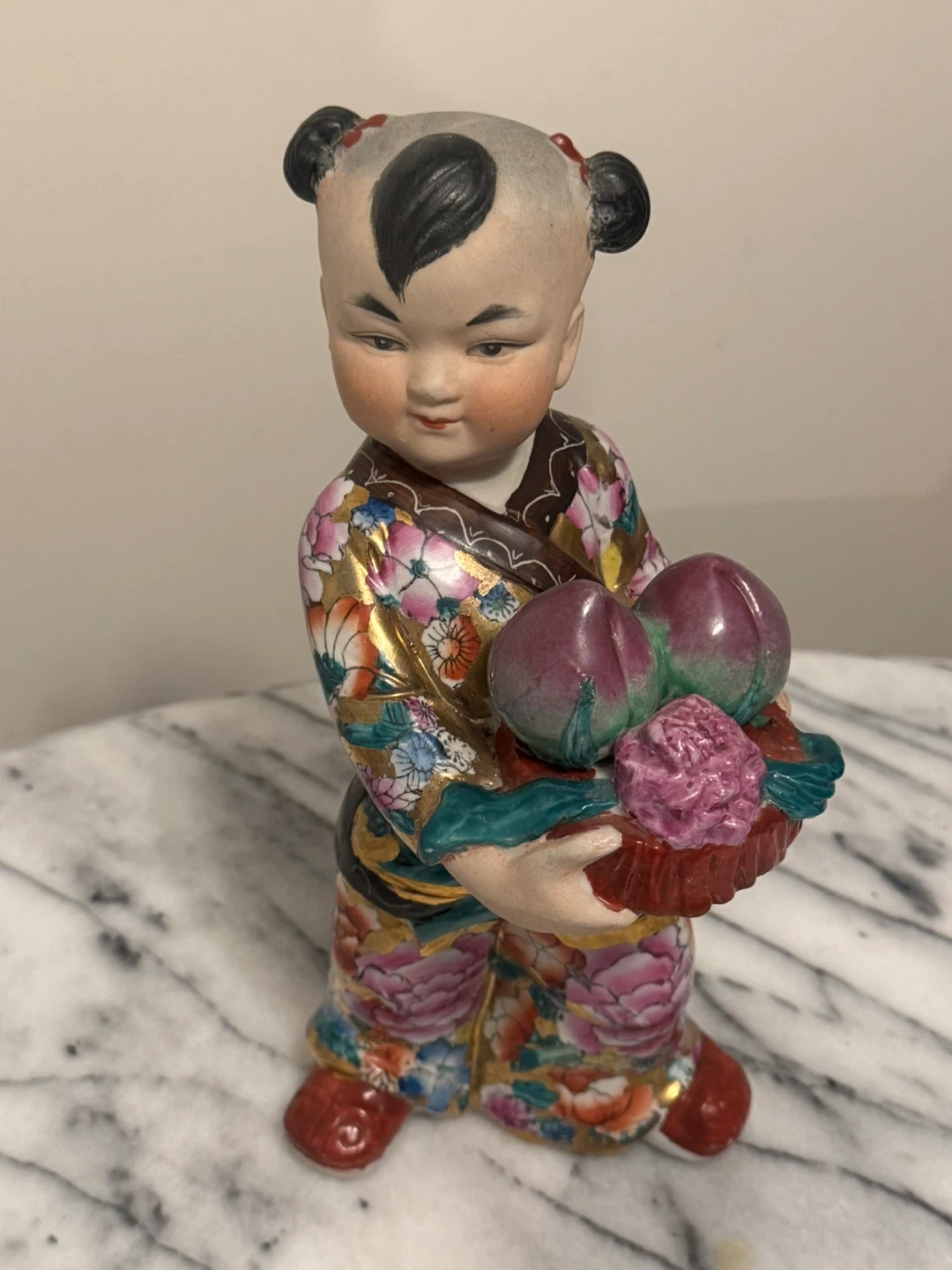 This ceramic figurine depicts a child in traditional, colourful clothing, holding a basket filled with fruit. It's intricately painted with floral patterns and gold accents. This piece would add a charming touch to any decor.