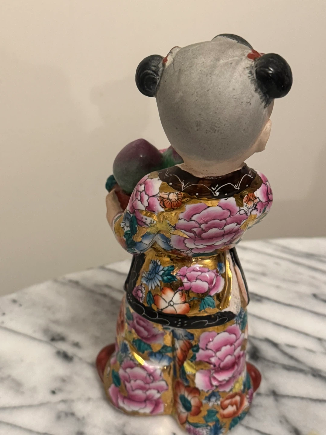 This ceramic figurine depicts a child in traditional, colourful clothing, holding a basket filled with fruit. It's intricately painted with floral patterns and gold accents. This piece would add a charming touch to any decor.