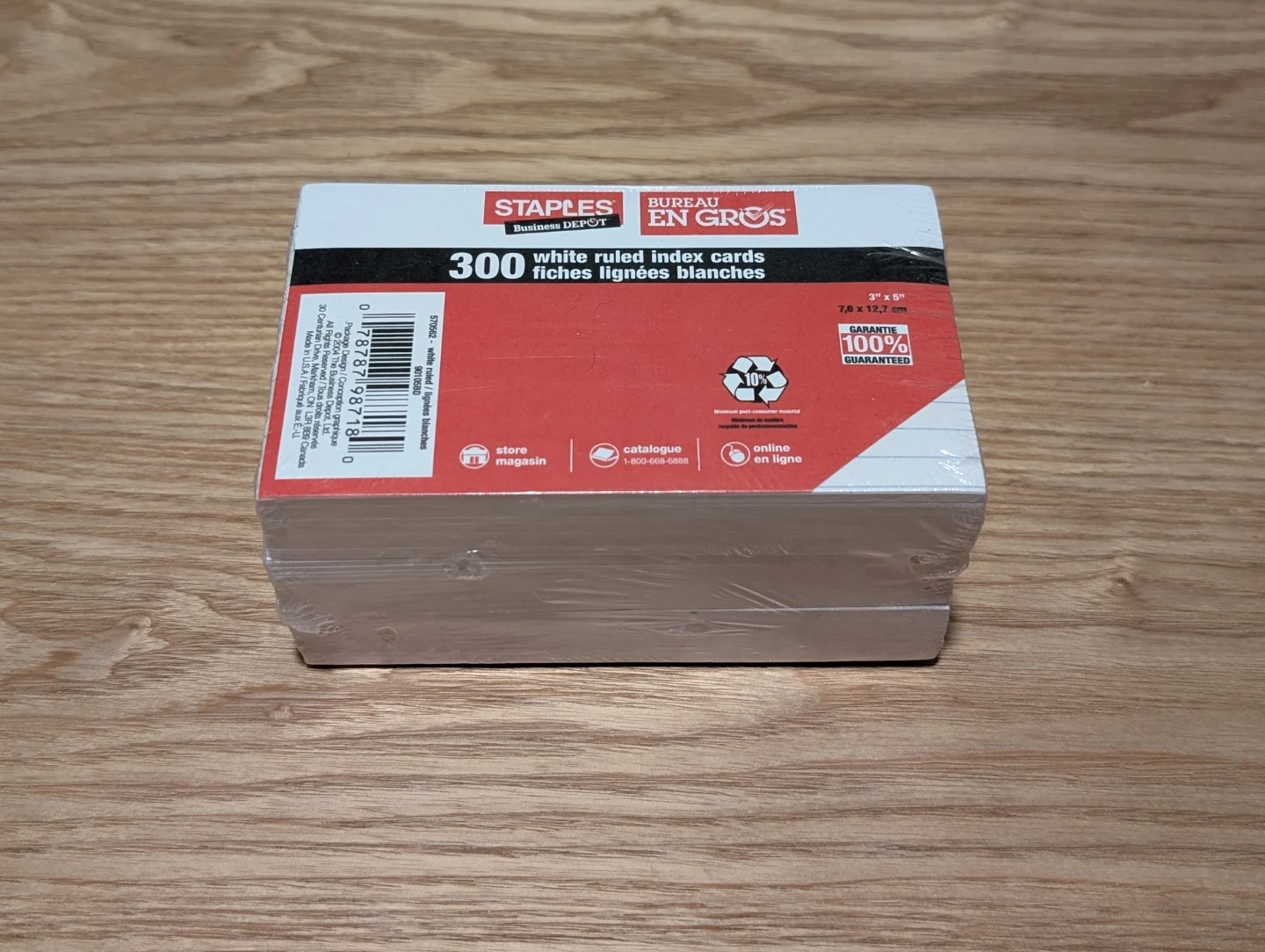 Staples brand white ruled index cards.