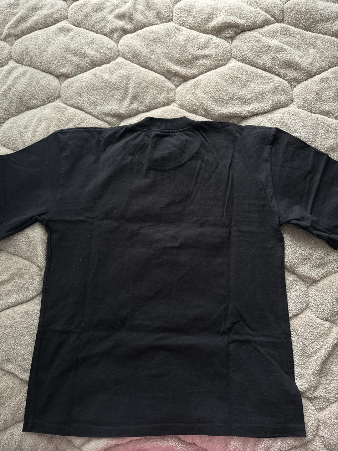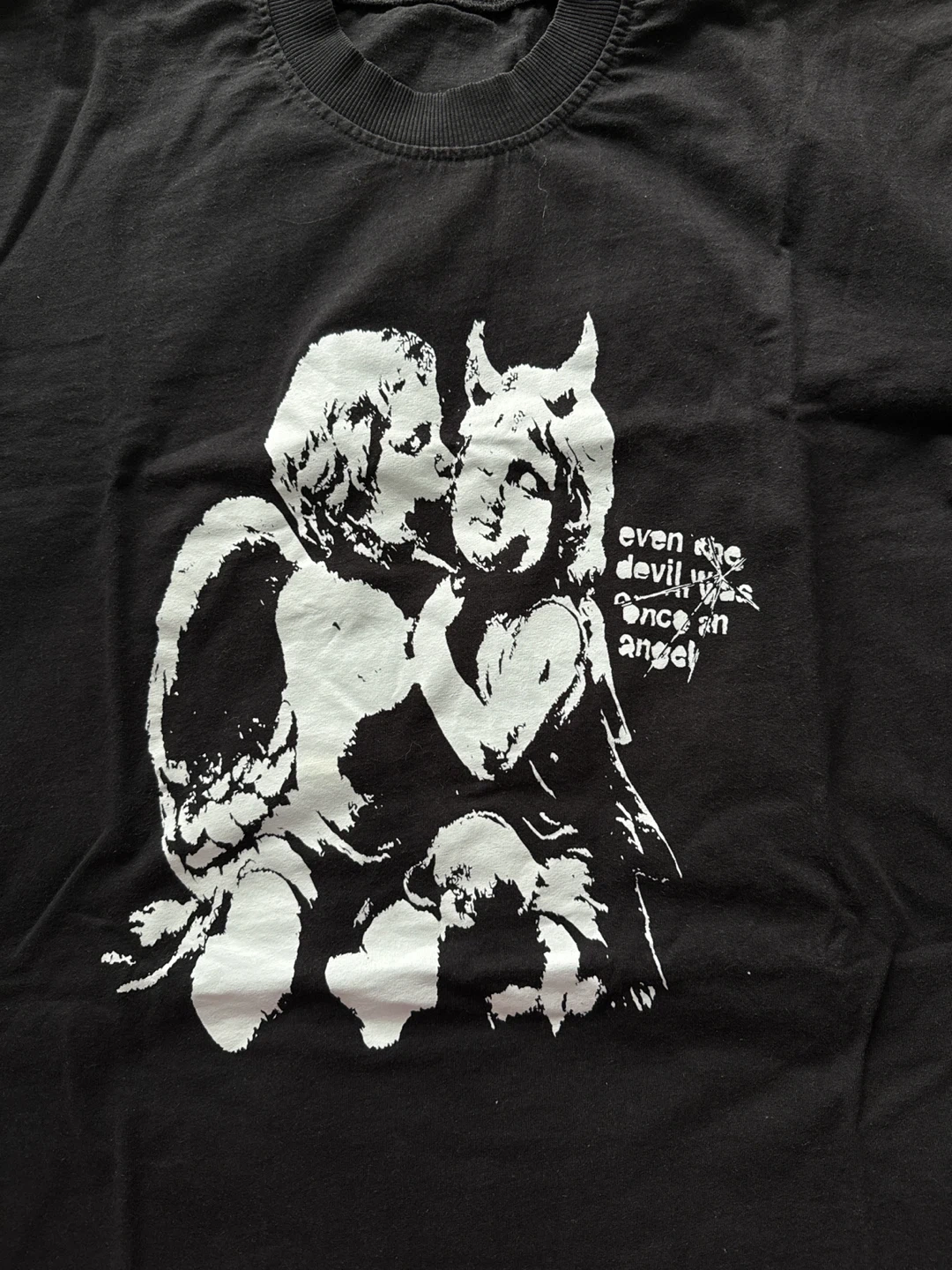 This is a black t-shirt with a graphic print on the front. The print features the text "even the devil was once an angel". It's made of cotton, bought from germany, oversize.