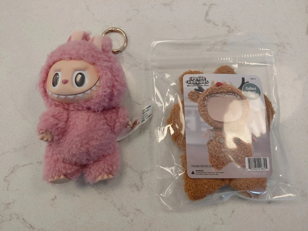 This is a pink plush keychain from THE MONSTERS. It also comes with a Petite Threads mini outfit for dolls 15 & 17cm. Collect them all!
