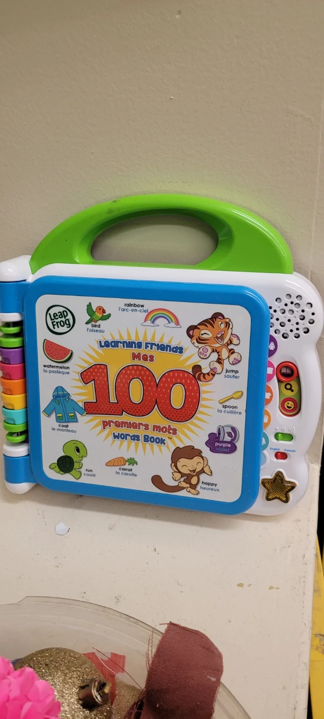 This LeapFrog Learning Friends book introduces 100 first words in English and French. It features colourful illustrations and interactive buttons for learning. Requires 2 AA batteries, not included.