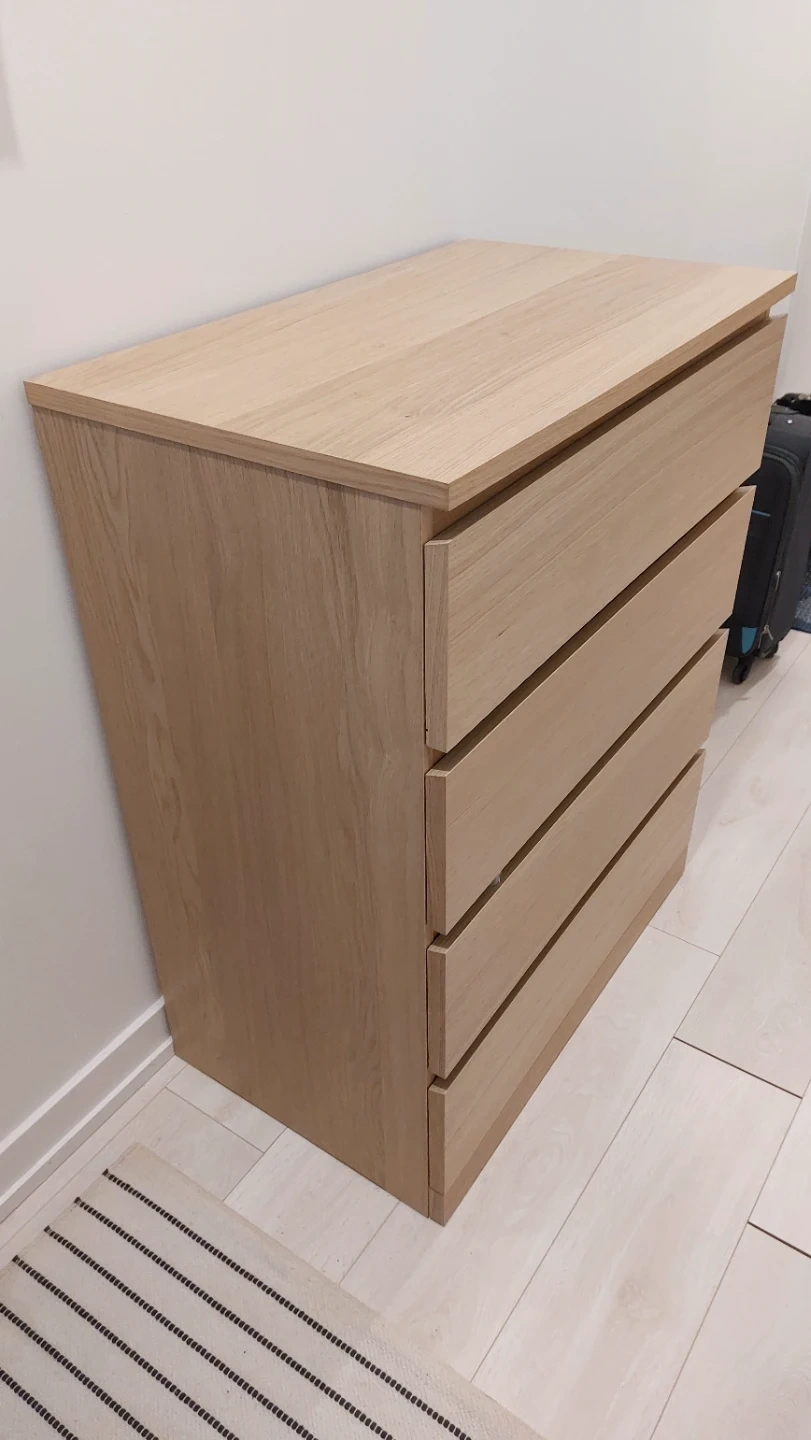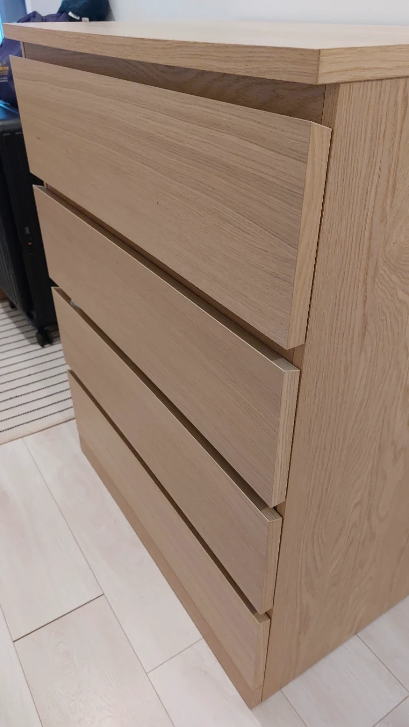 This dresser has a light wood finish and four drawers. The drawers are mounted on metal glides. It's a handy piece for storing clothes or other items.