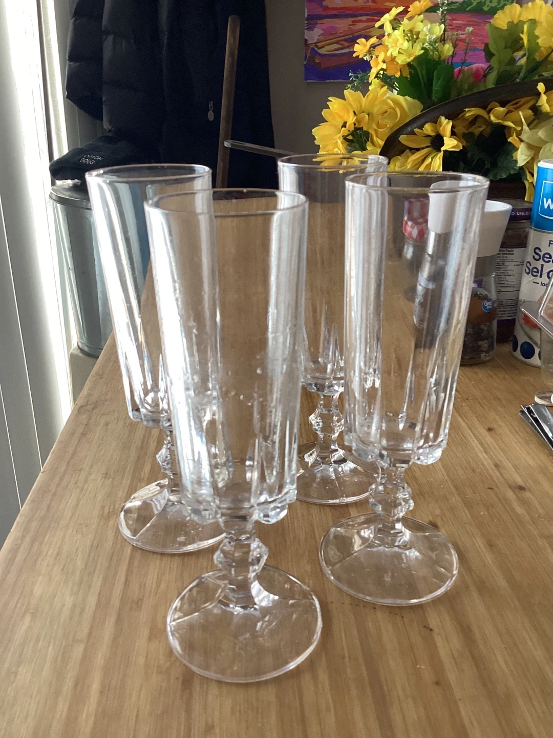 A set of four clear glass champagne flutes. These elegant glasses feature a fluted design on the bowl and a decorative stem. Perfect for toasting special occasions!