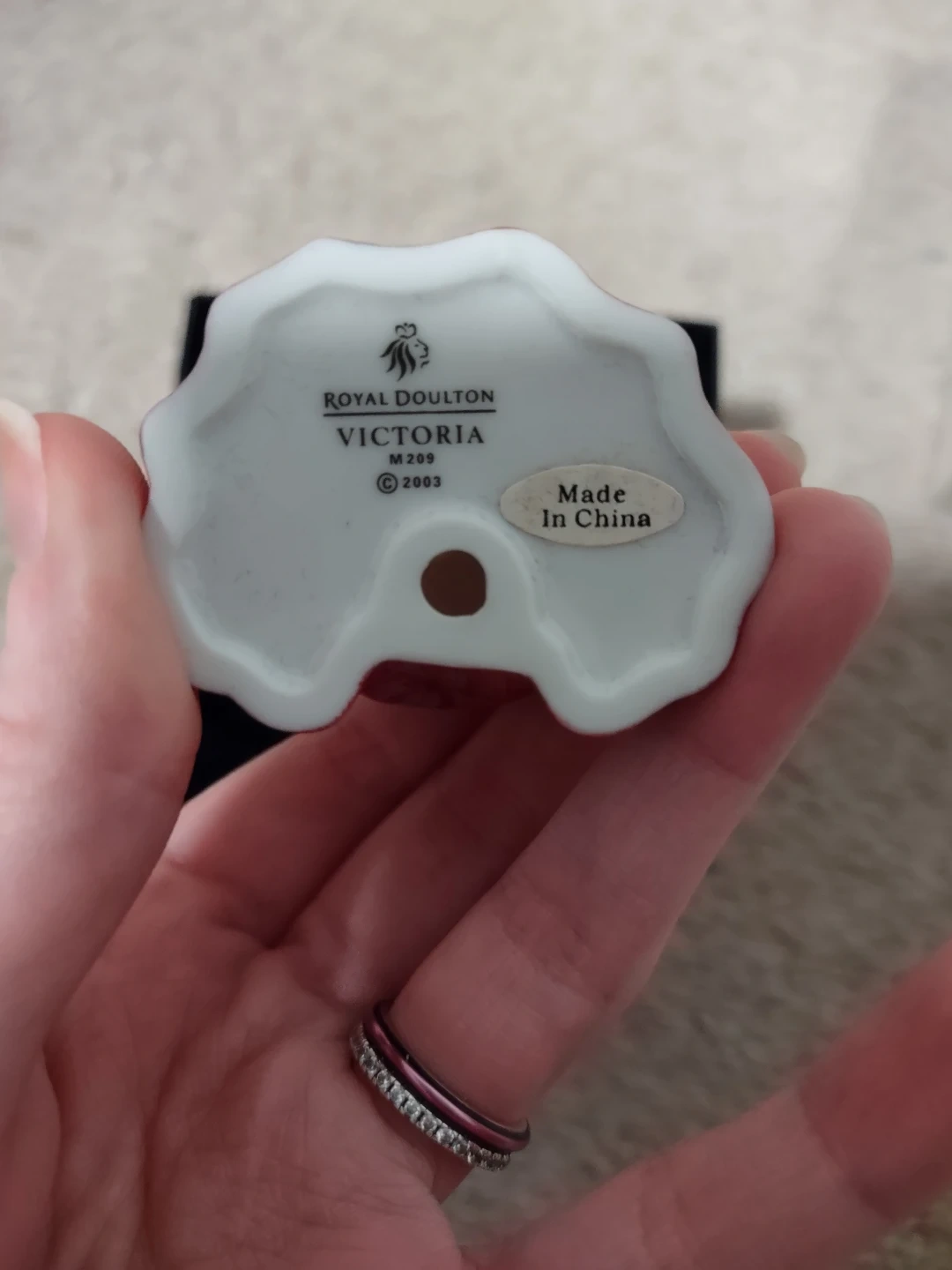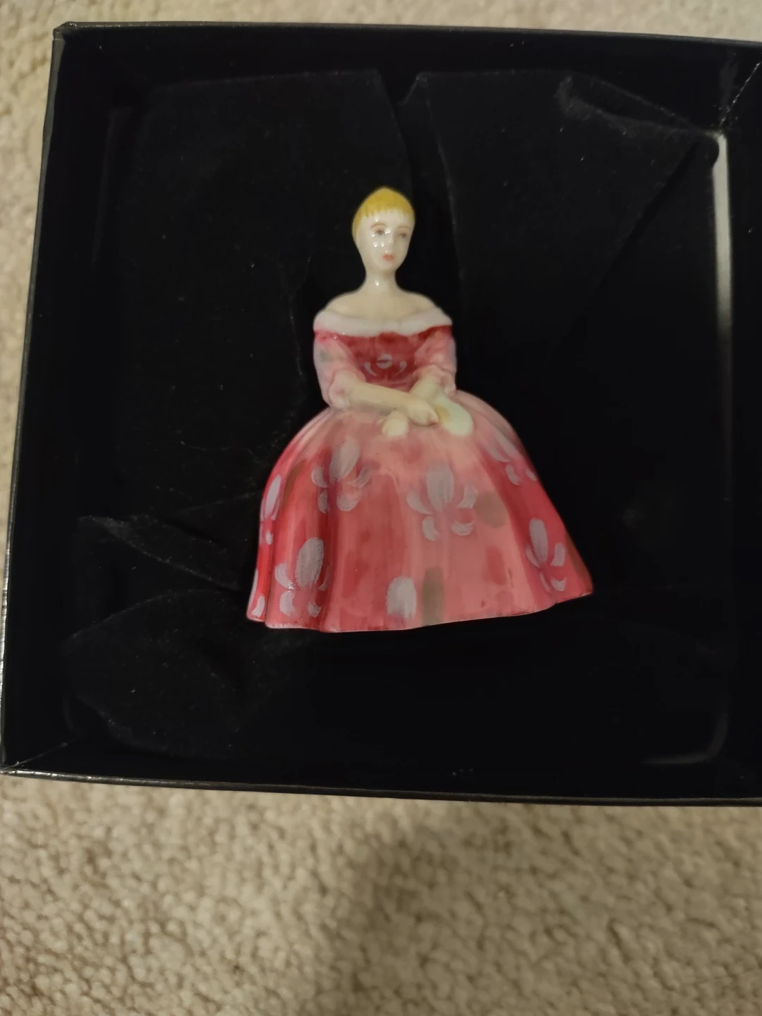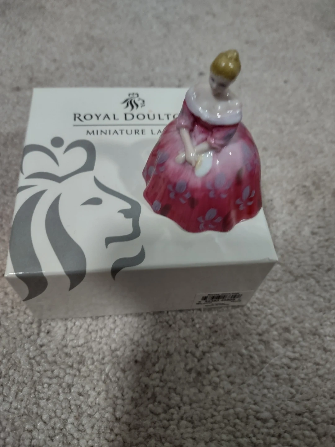 This is a Royal Doulton Victoria figurine from the Miniature Ladies collection. It's made of porcelain and comes in its original box.