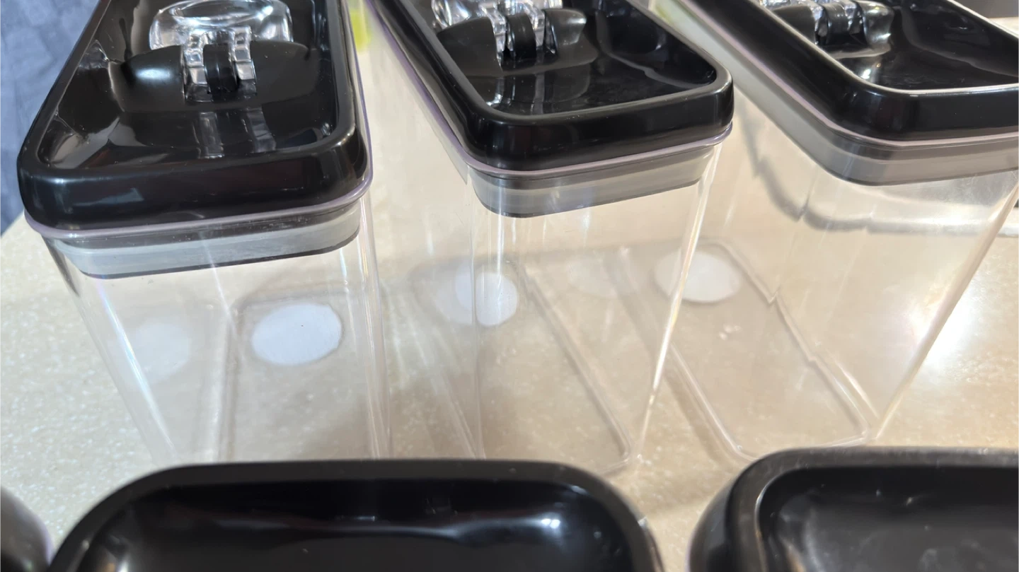 This is a set of 9 boxes airtight food storage containers. They feature a black lid with a clear push-button mechanism for easy sealing. These clear plastic containers are great for organizing your pantry or fridge. They're durable and designed to keep your food fresh!