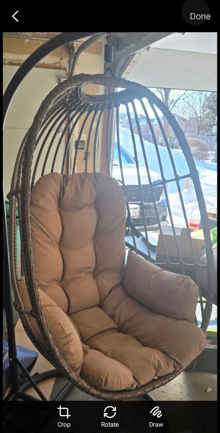 Comfortable wicker hanging egg chair with a plush tan cushion. This chair is designed for relaxation and would look great indoors or outdoors. Its unique design makes it a cozy spot to unwind.
