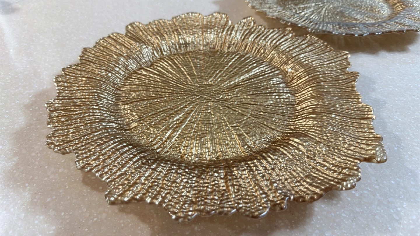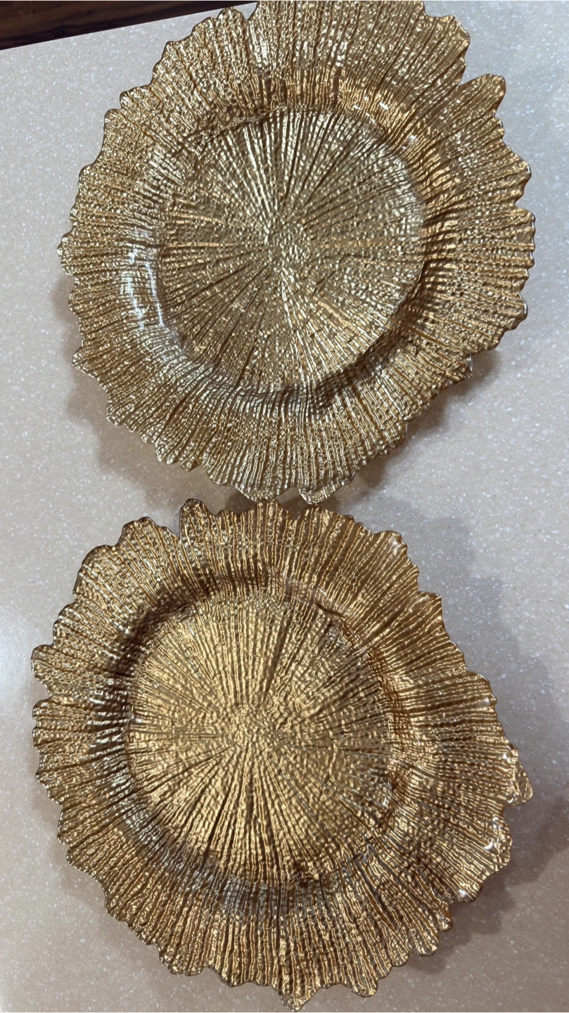 This set includes two gold charger plates with a unique textured design. The ruffled edges add a touch of elegance to any table setting. They're a great way to elevate your dining experience for special occasions!