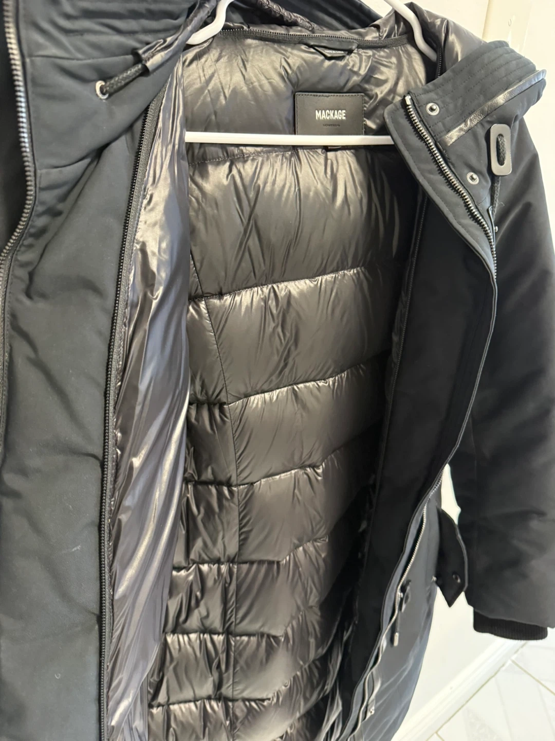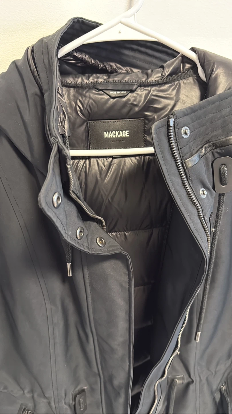 MACKAGE black down-filled parka jacket. It's insulated for warmth and features a hood. Zipper closures and pockets are visible.