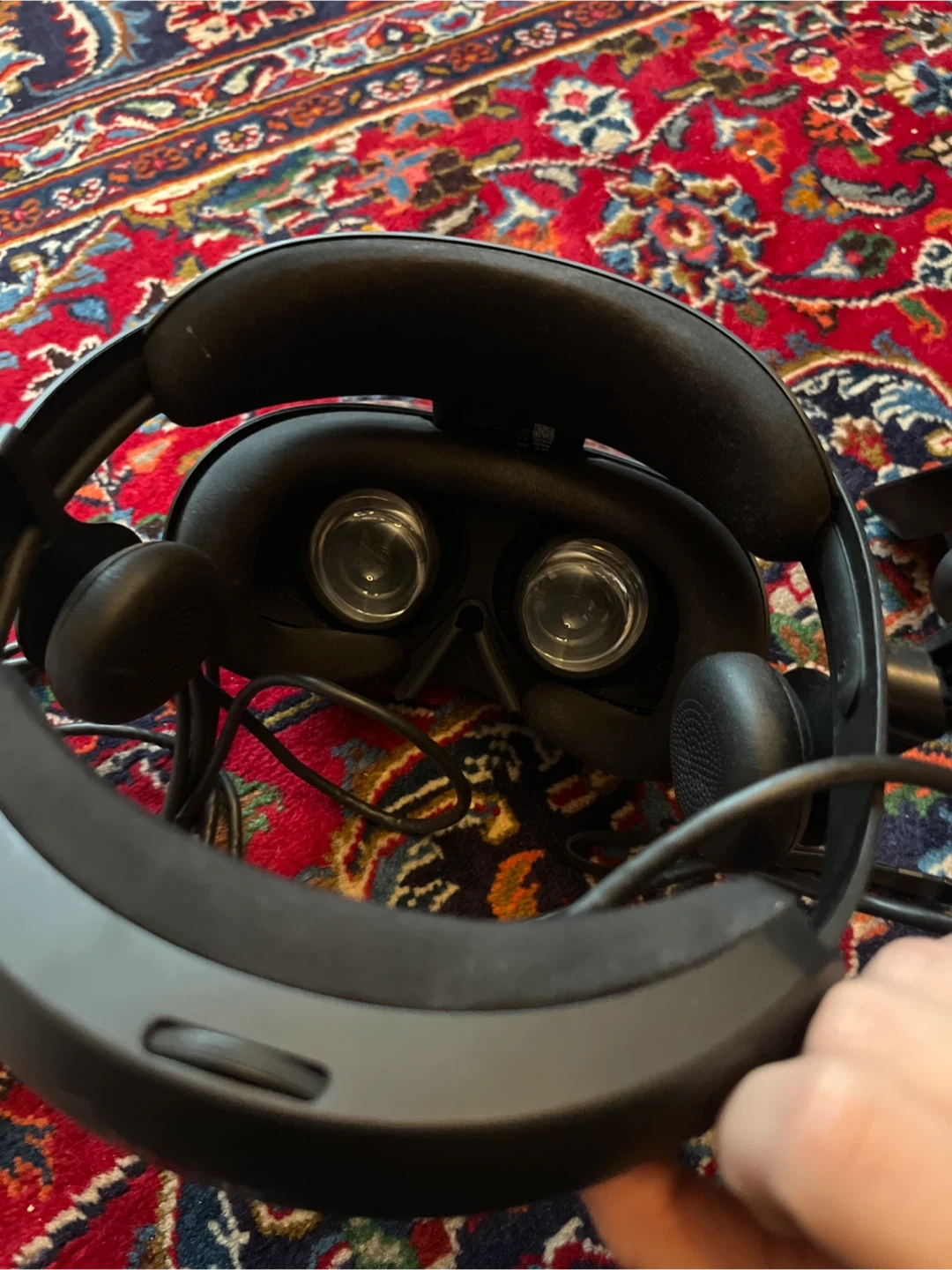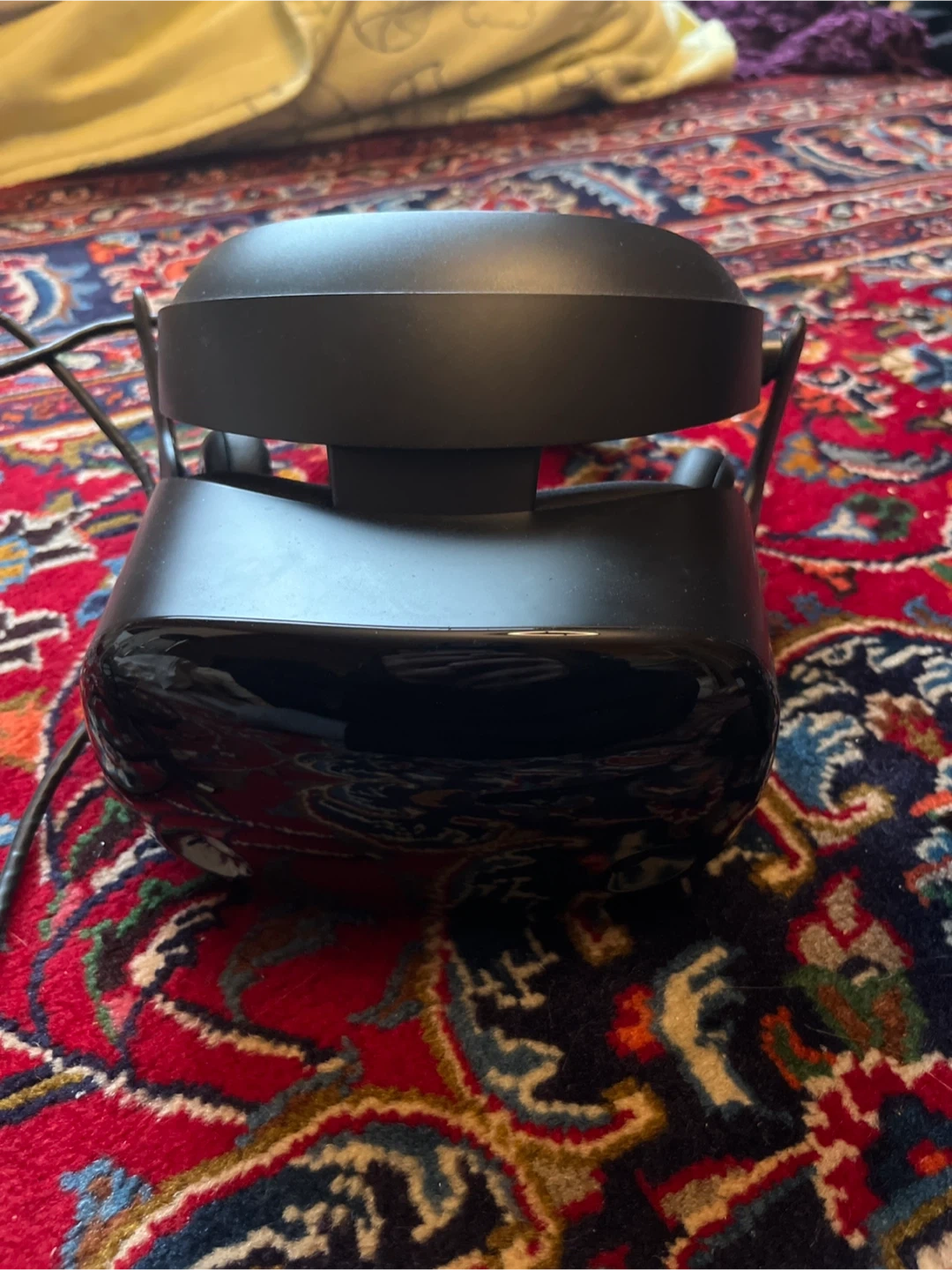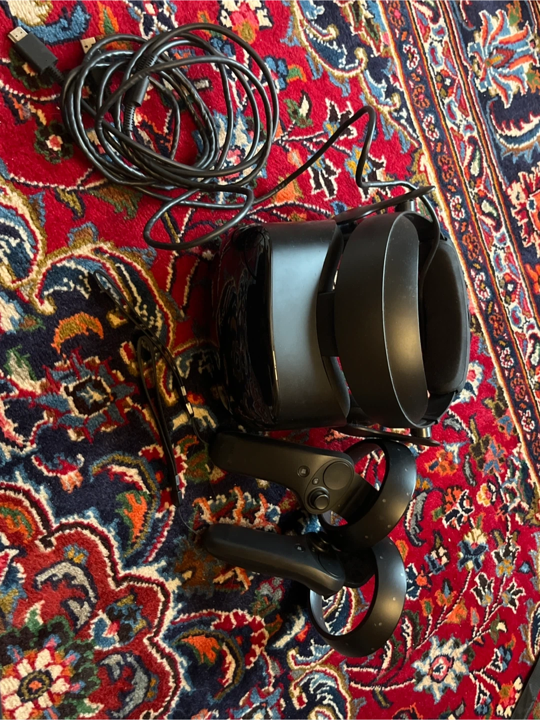 Samsung HMD Odyssey virtual reality headset and two controllers. It comes with all necessary cables. This VR headset offers an immersive visual experience with its high-resolution display.