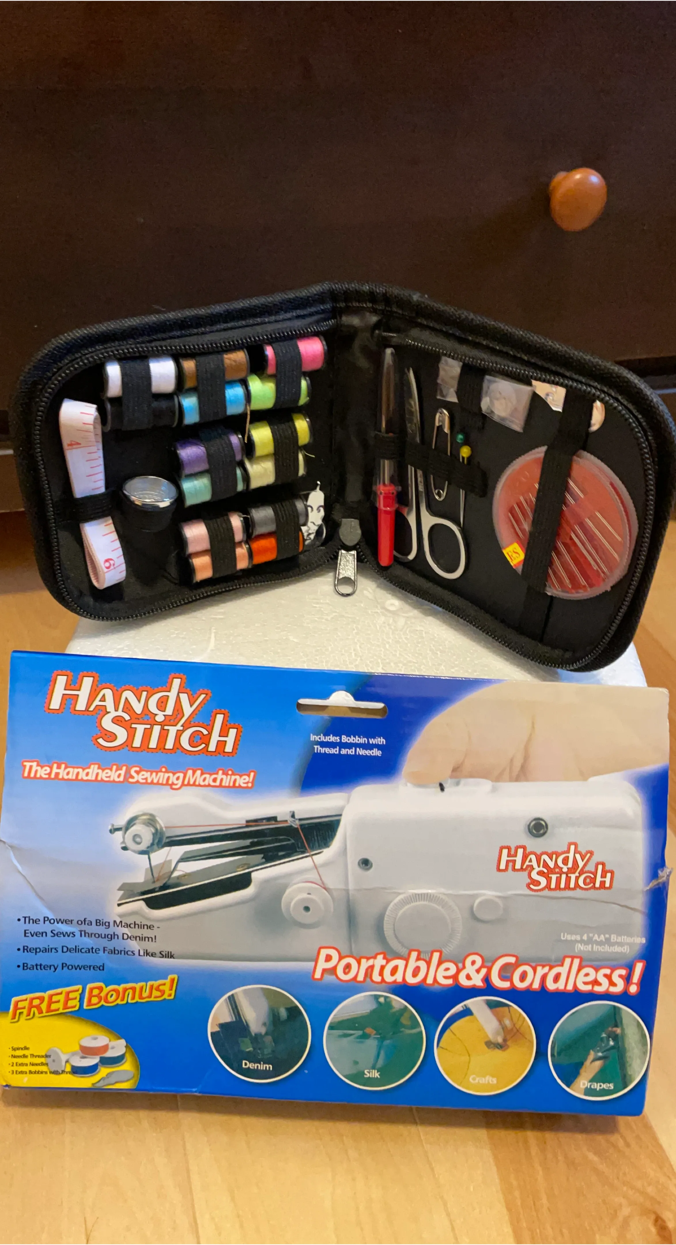 This Handy Stitch is a portable and cordless handheld sewing machine. It's battery-powered and can handle denim and delicate fabrics. Includes bobbin with thread and needle, spindle, needle threader, extra needles, and extra bobbins.