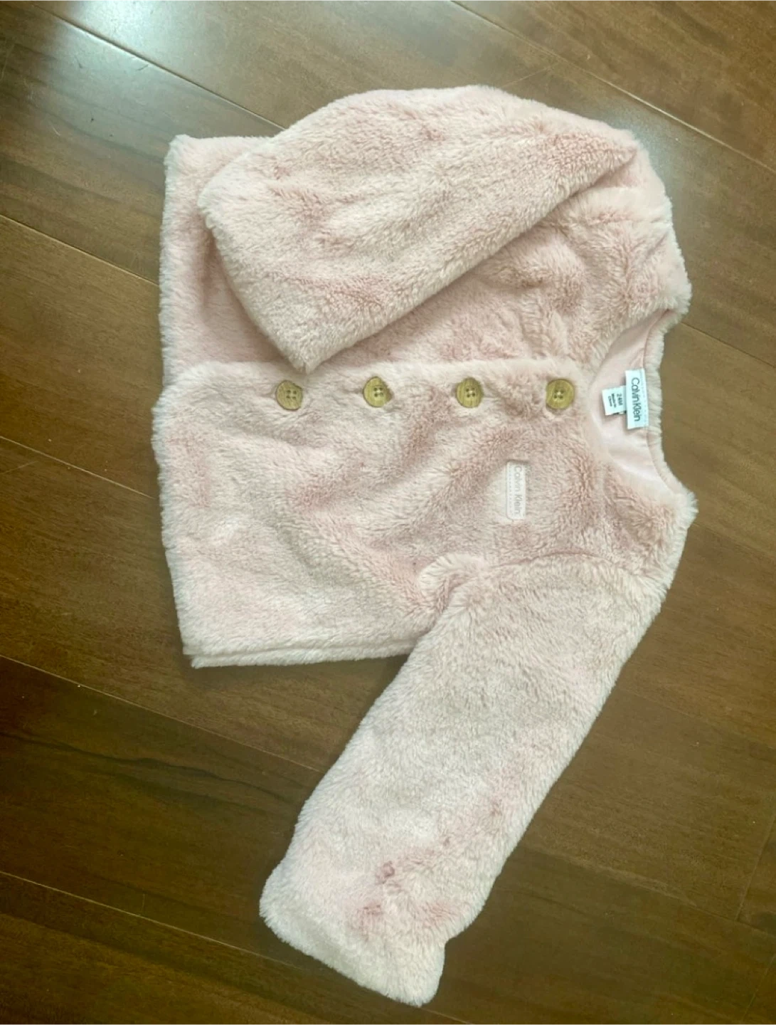 Cozy girl pink faux fur jacket It features a soft lining and wooden button closures. Super warm and cuddly!