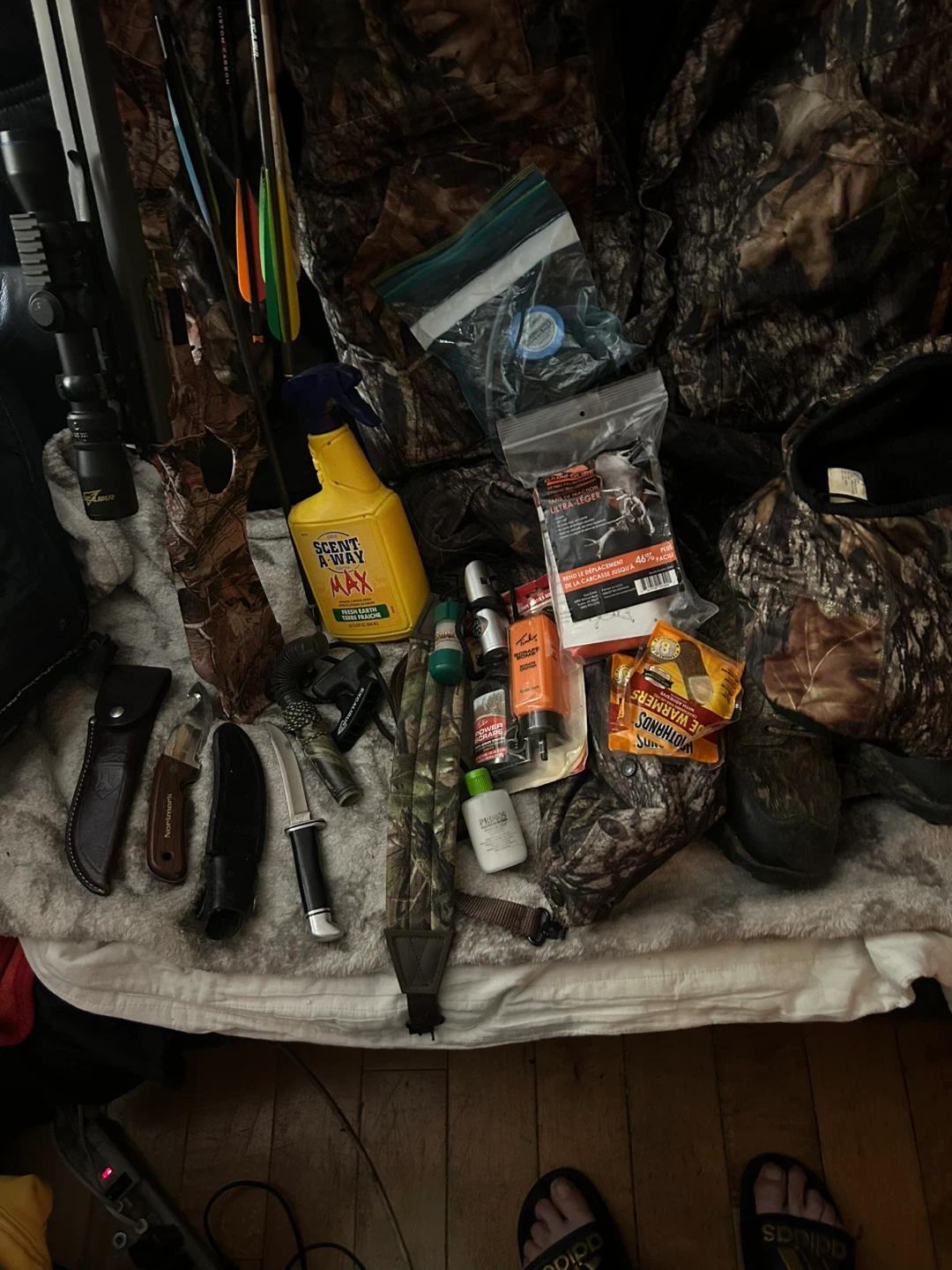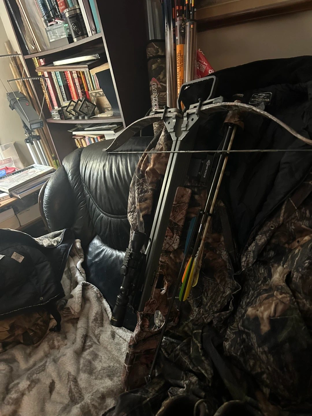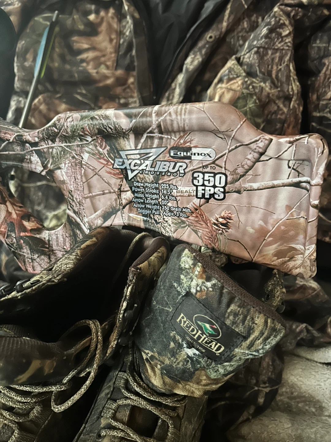 Excalibur Equinox crossbow with Equinox scope. Features 350 FPS velocity, 15.5" power stroke, 165 lbs draw weight, and 30" arrow length. Includes 4 arrows and RedHead boots.