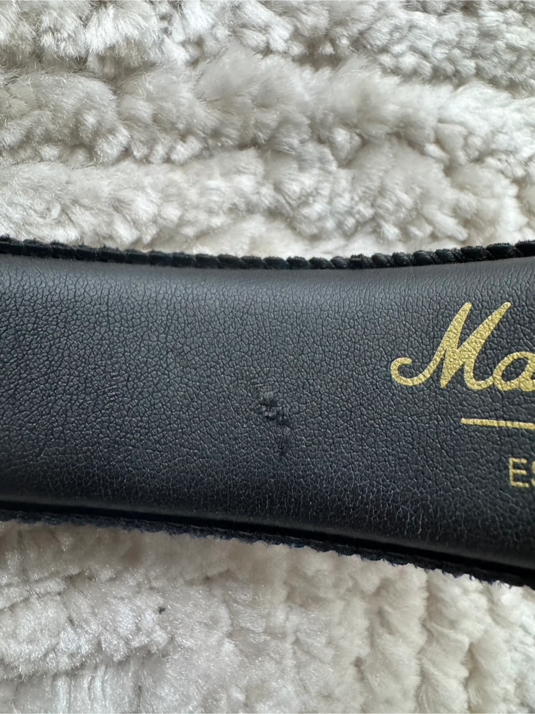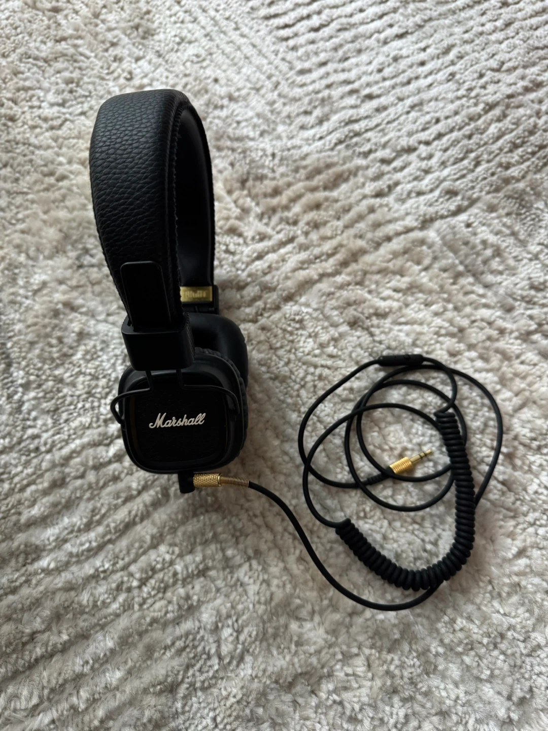 Marshall on-ear headphones in black. Comes with a coiled audio cable. Some minor wear visible on the headband.
