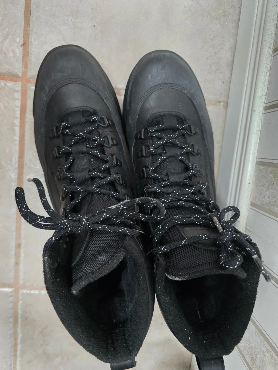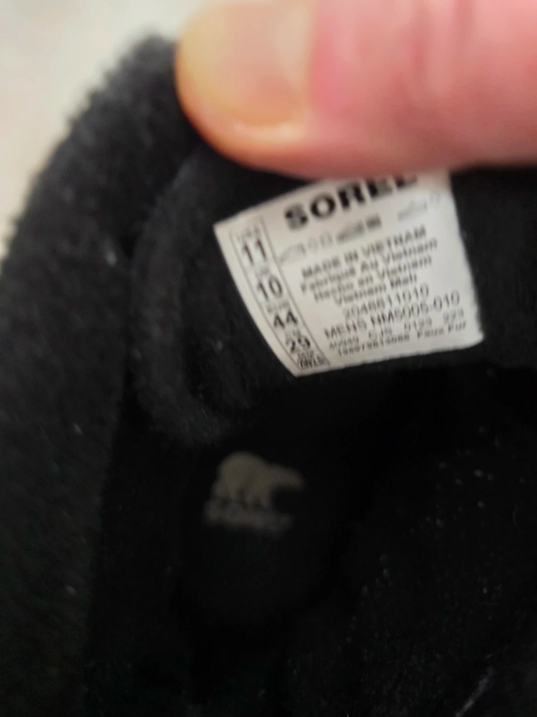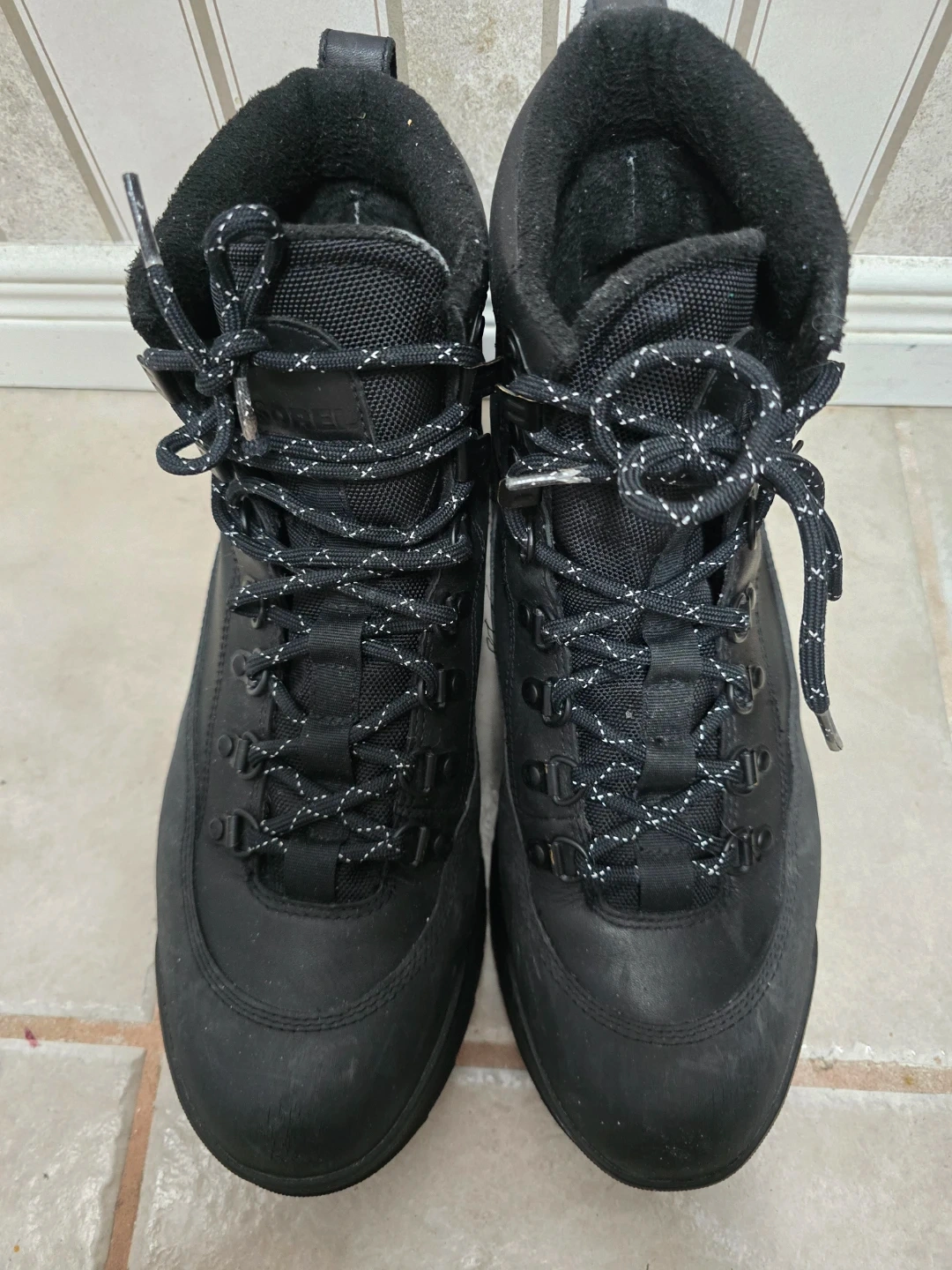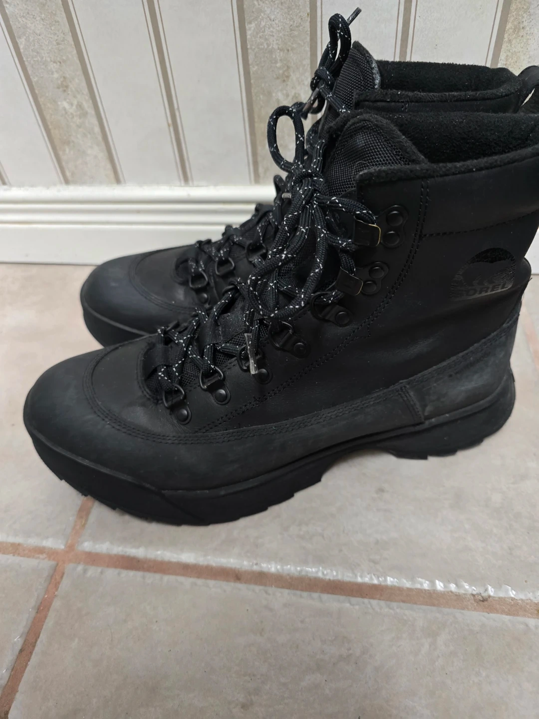 These are Sorel black winter boots. They're made with durable materials and have a rugged sole for traction. Lace-up closure ensures a snug fit. Size 11 Men's.