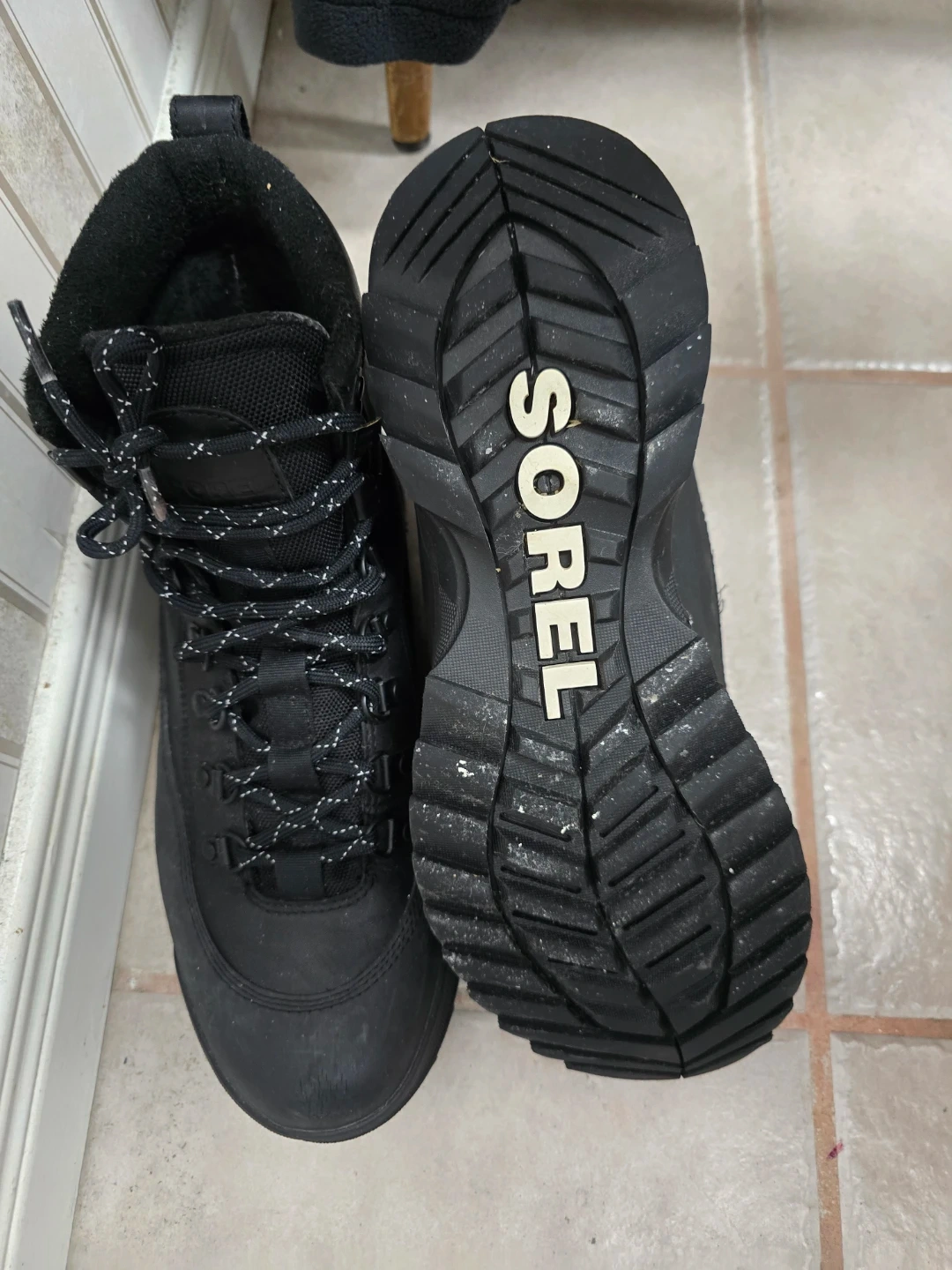 These are Sorel black winter boots. They're made with durable materials and have a rugged sole for traction. Lace-up closure ensures a snug fit. Size 11 Men's.