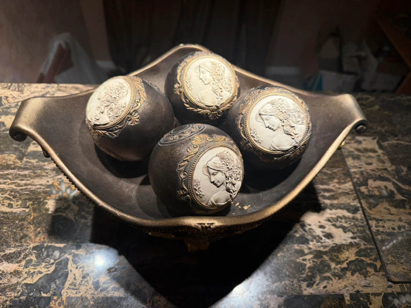 Four decorative balls featuring a classic cameo design with antique gold accents. These ornate spheres add a touch of vintage charm to any display. They're suitable for a decorative bowl or shelf arrangement. Add elegance to your home decor!