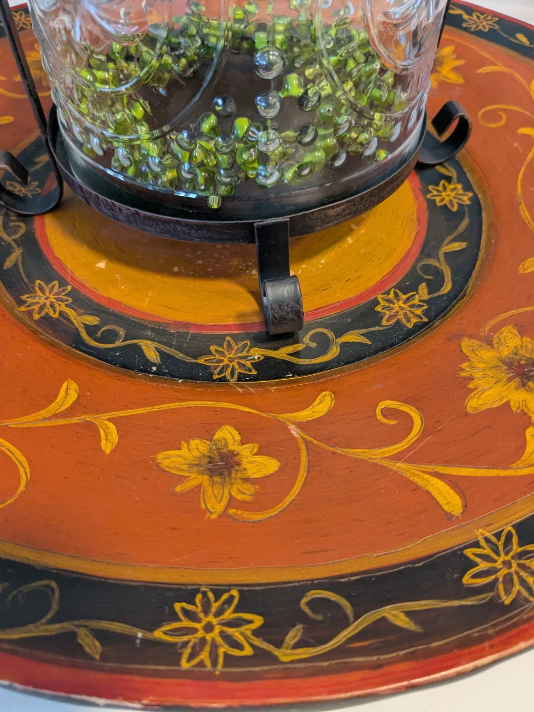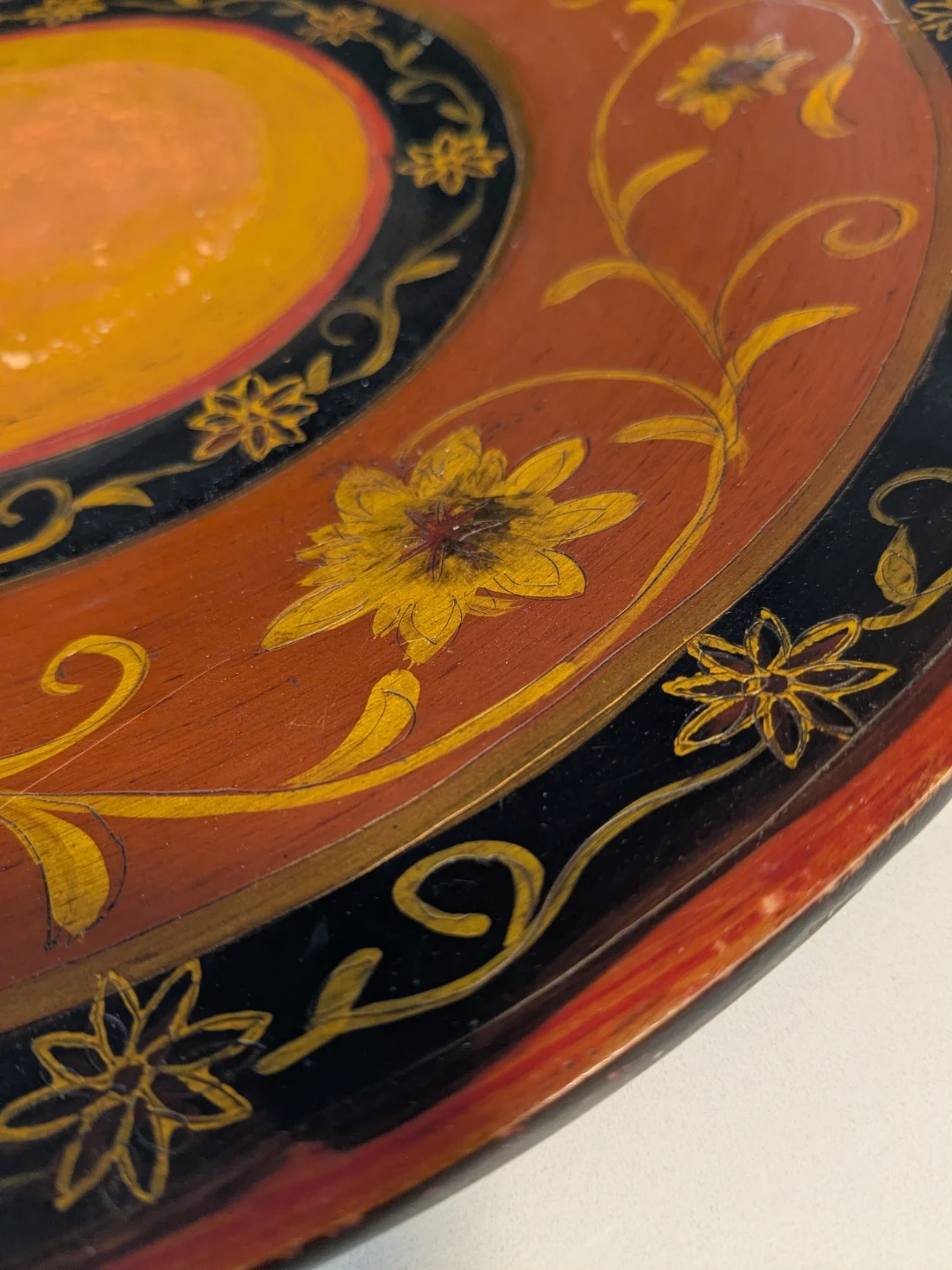 This wooden side table features a vibrant orange, black, and yellow floral pattern. It's a lovely accent piece for any room. Perfect for holding a drink or a small decorative item!