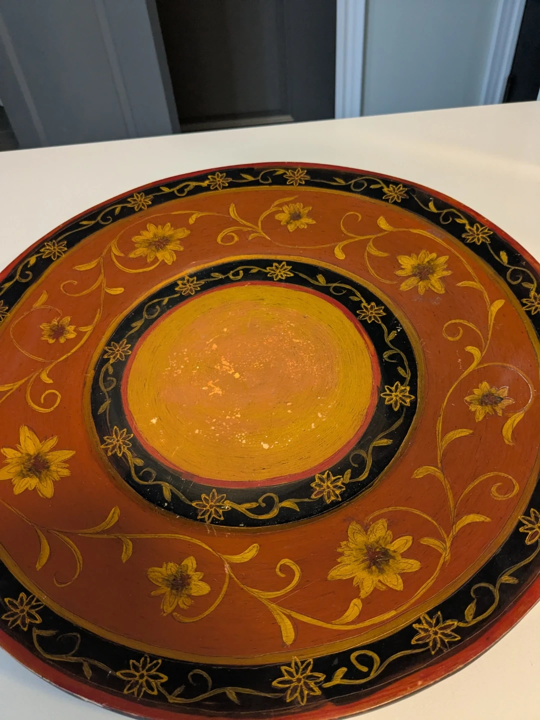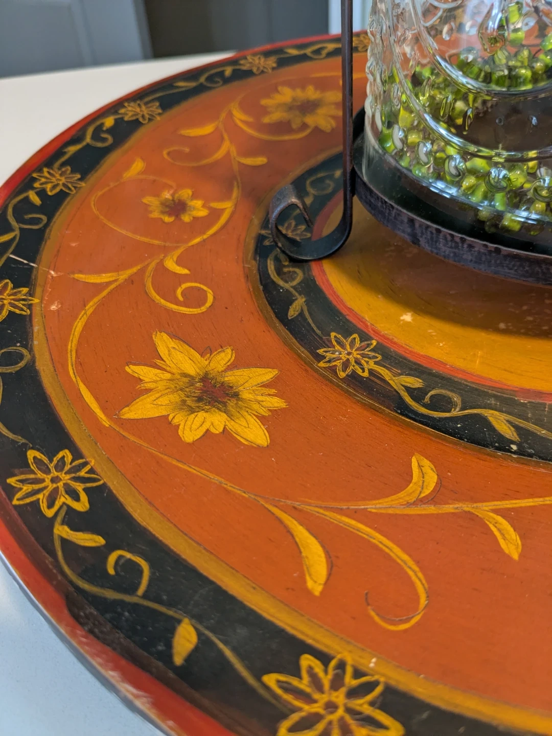 This wooden side table features a vibrant orange, black, and yellow floral pattern. It's a lovely accent piece for any room. Perfect for holding a drink or a small decorative item!