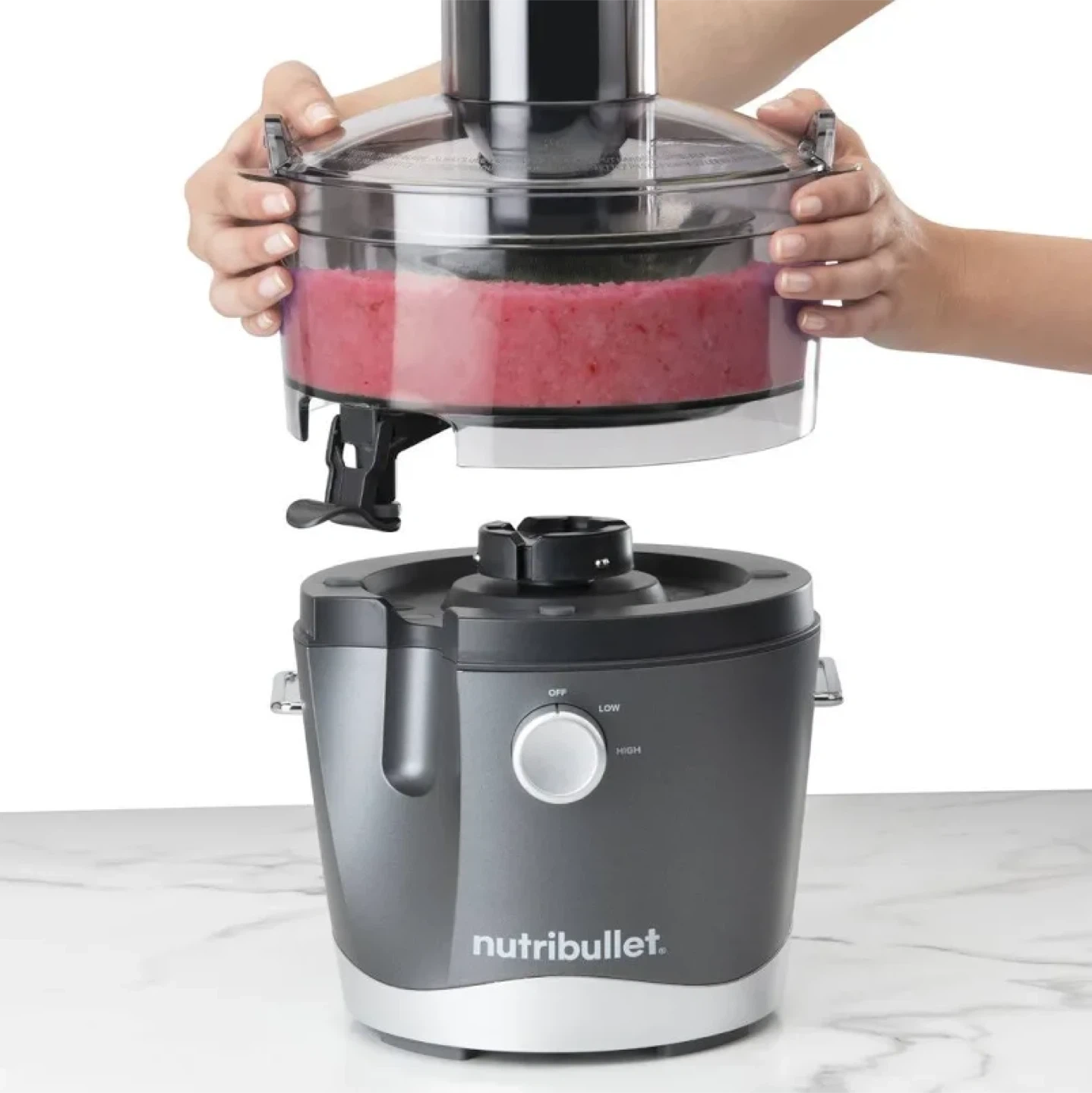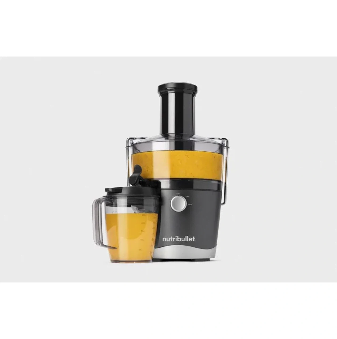 Make fresh juice with this NutriBullet juicer. It has a removable pulp bin and a large capacity juice pitcher. Easy to clean and operate!