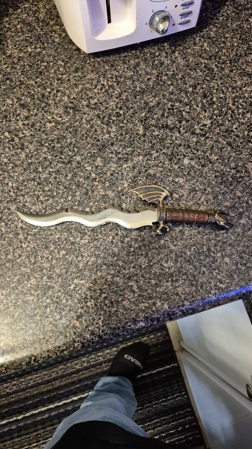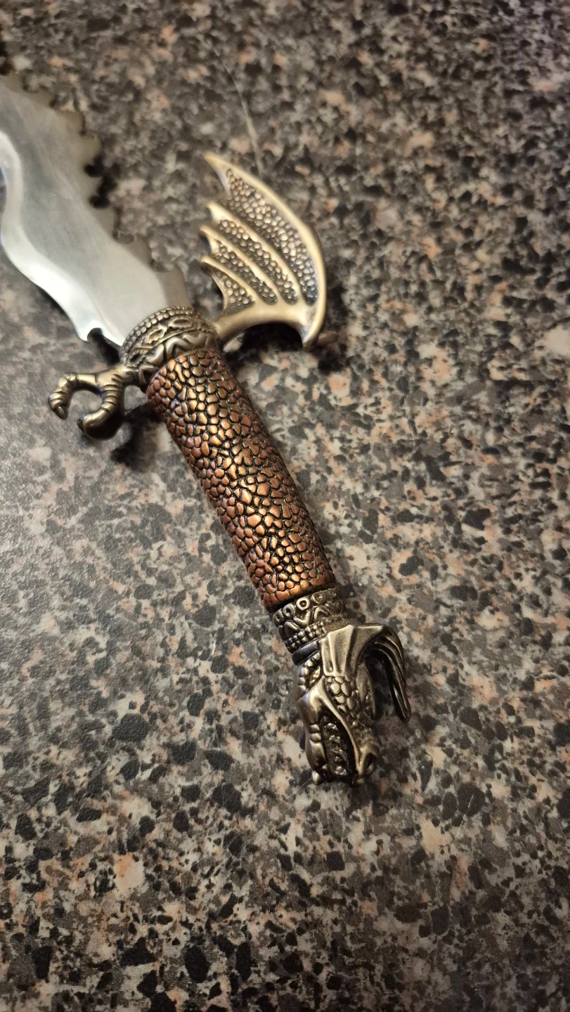 This decorative dagger features a unique wavy blade and a detailed dragon-themed handle. The dragon head pommel and winged guard add a fantasy flair. It's a striking piece for display.