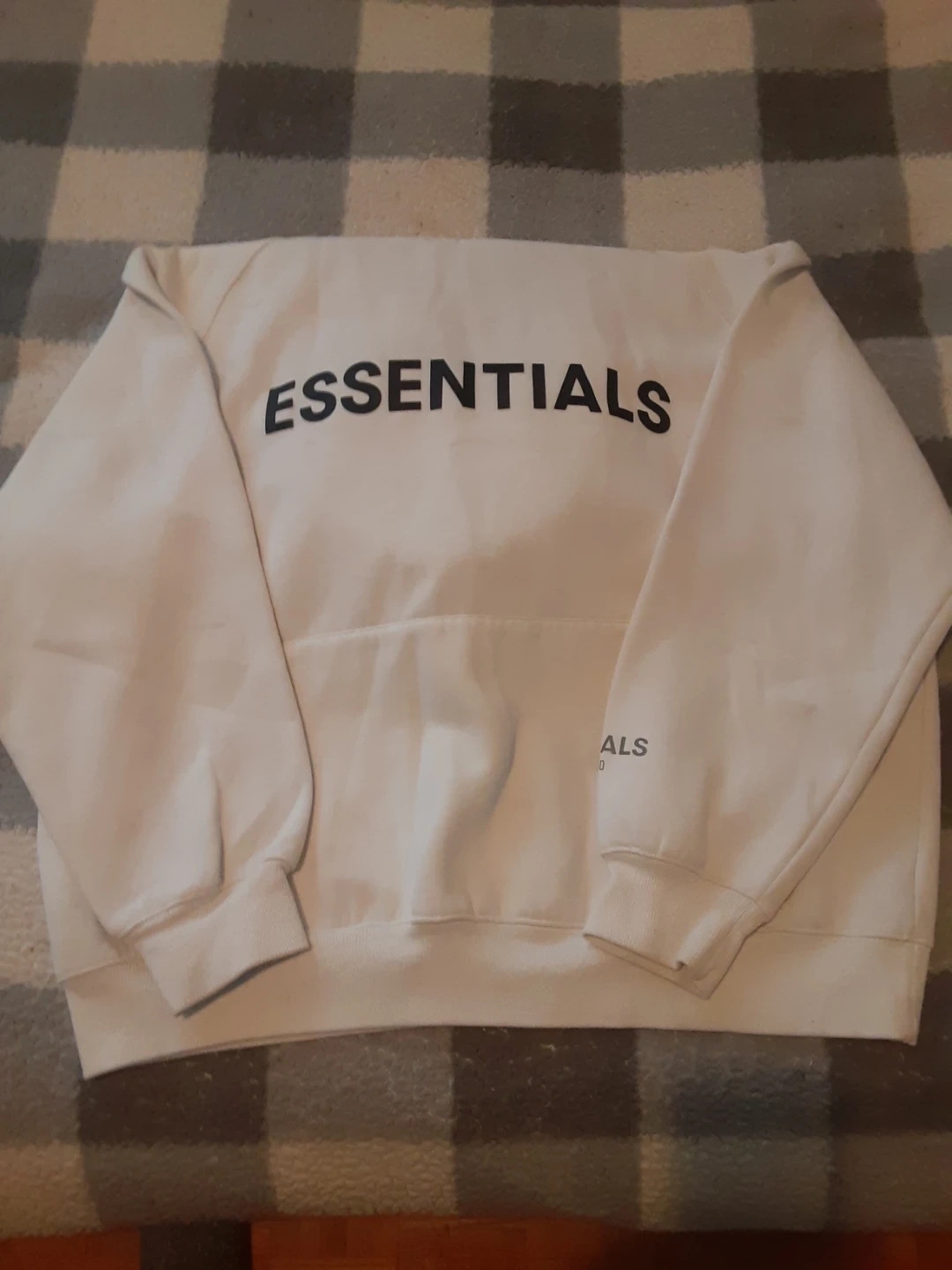 White Fear of God Essentials hoodie. Pullover style with front pouch pocket. Ribbed cuffs and hem. Made of a cotton blend.