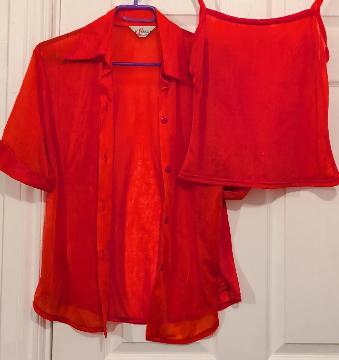 This is a red button-up shirt with a matching camisole. The fabric appears to be lightweight and slightly textured. It's a two-piece set.