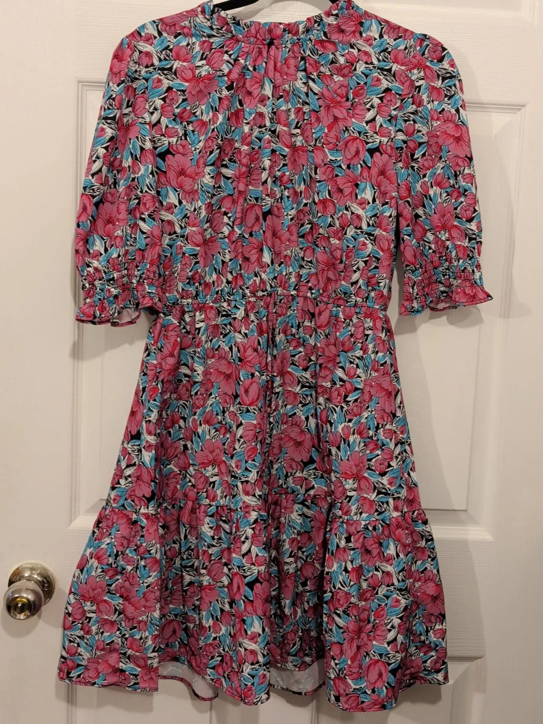 This is a lovely midi dress with a vibrant floral print. It features a high neckline with a subtle ruffle detail and a flattering cinched waist. The sleeves are a breezy 3/4 length with elasticated cuffs, and the skirt has a tiered, flowy design. Material is lightweight and breathable.