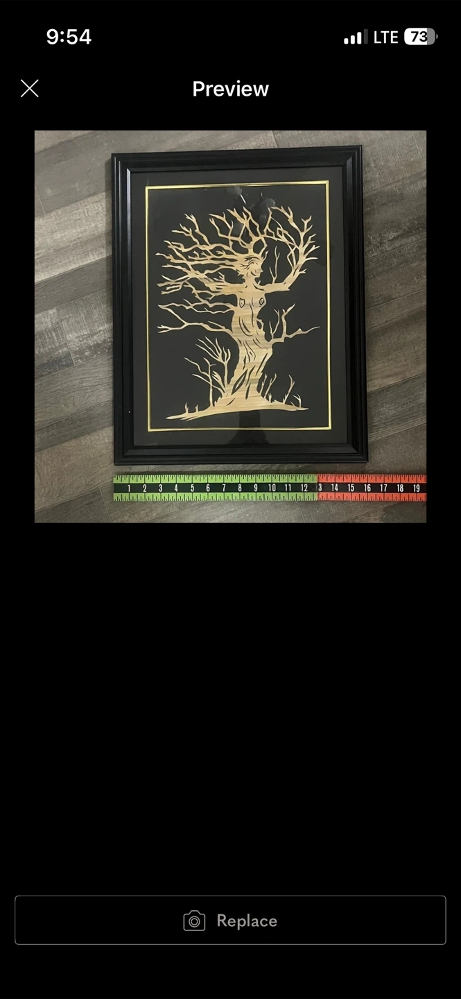 This unique framed art piece features a intricate wood cutout depicting a woman transforming into a tree. It's framed in black with a gold inner border. The art is approximately 11 inches by 17 inches. It's perfect for adding a touch of nature-inspired artistry to your home decor!