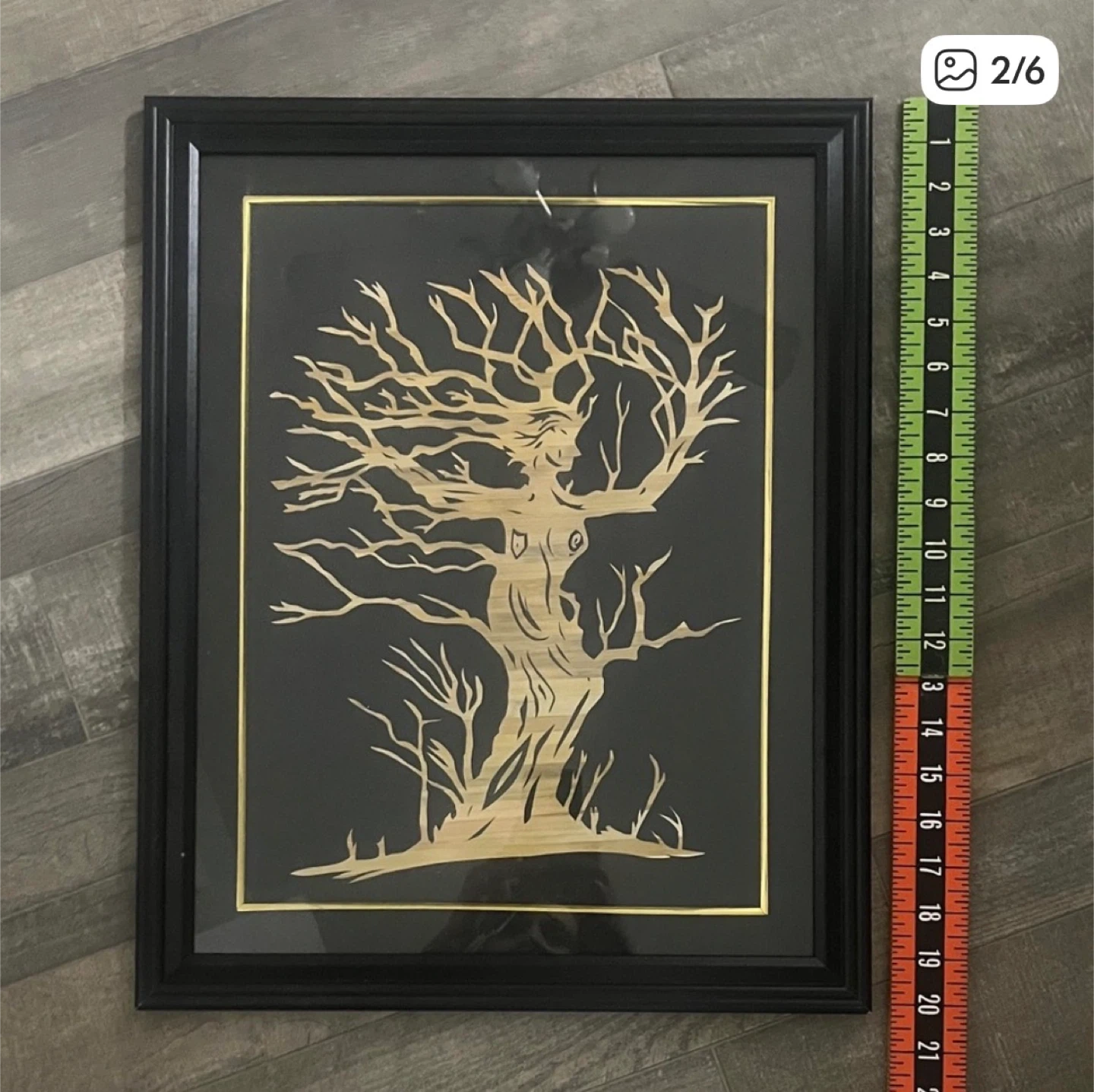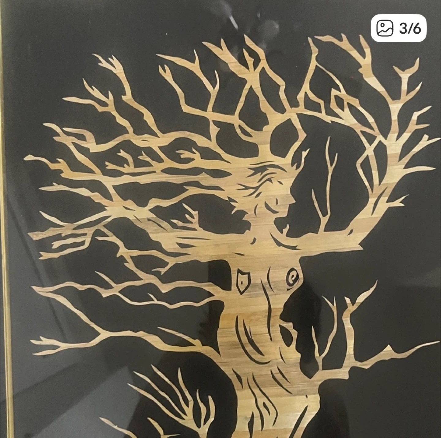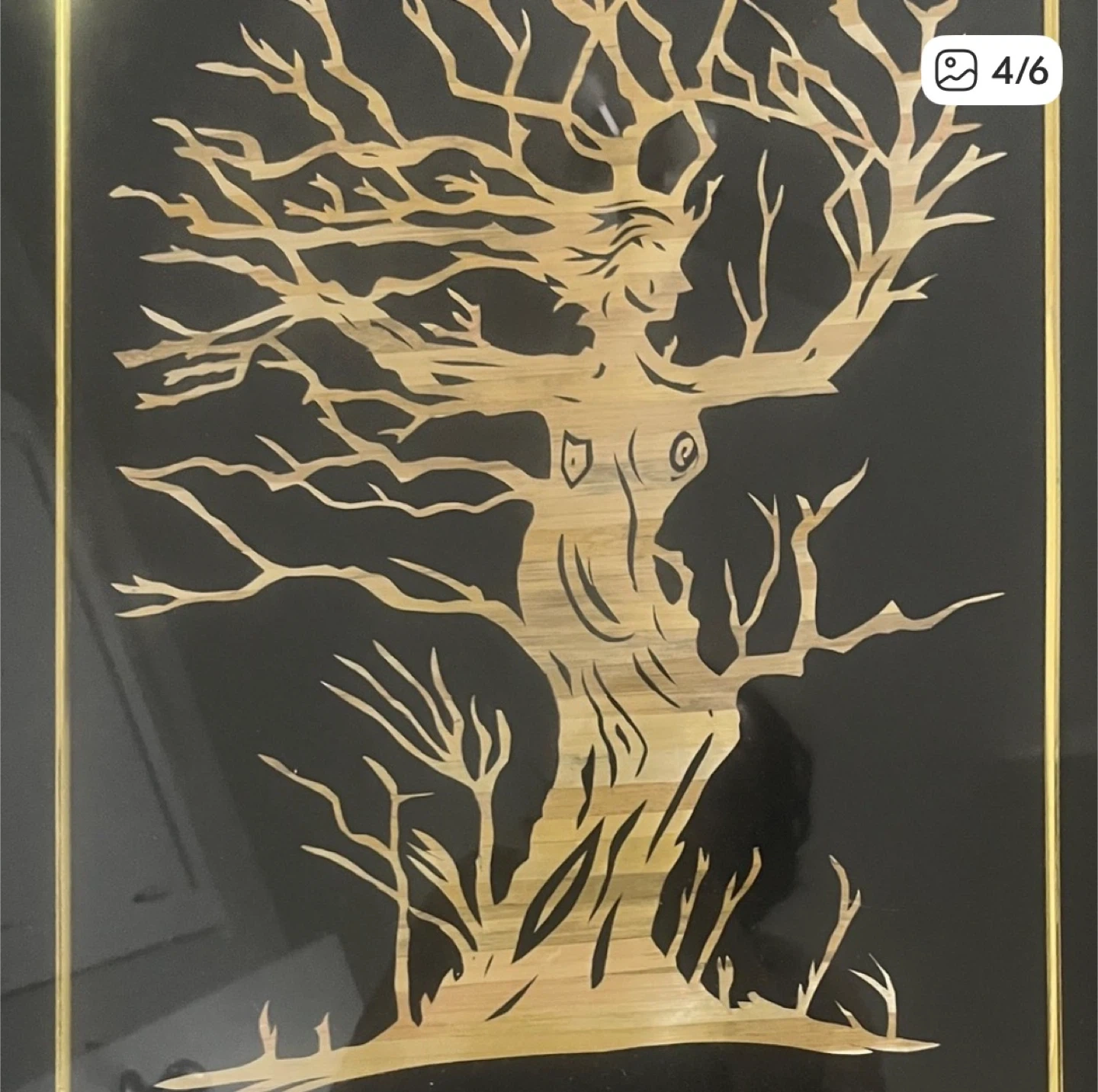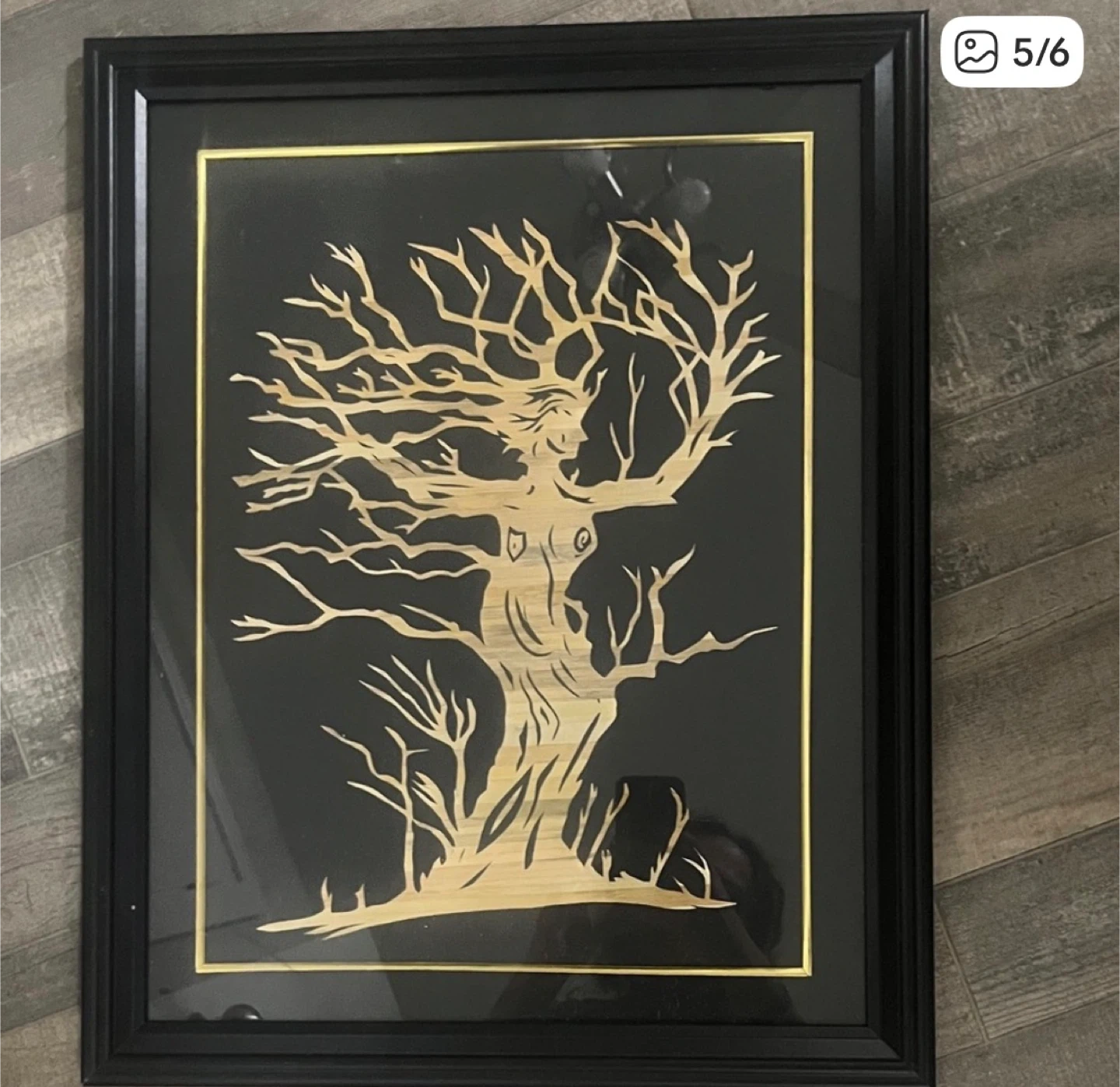 This unique framed art piece features a intricate wood cutout depicting a woman transforming into a tree. It's framed in black with a gold inner border. The art is approximately 11 inches by 17 inches. It's perfect for adding a touch of nature-inspired artistry to your home decor!