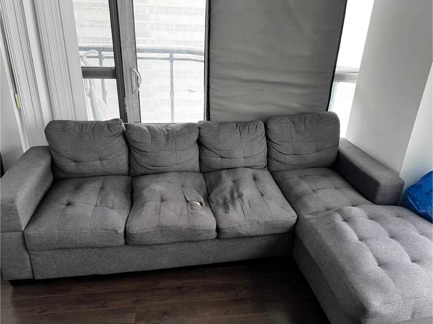 This is a grey sectional sofa. It's upholstered in a durable fabric with tufted seat cushions. There's some minor wear on the seat cushion and springs