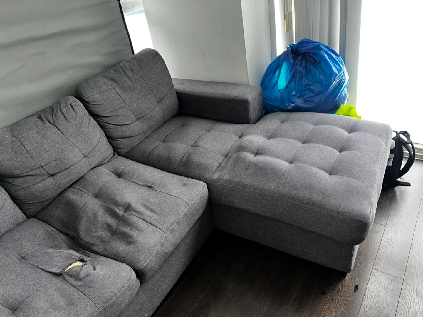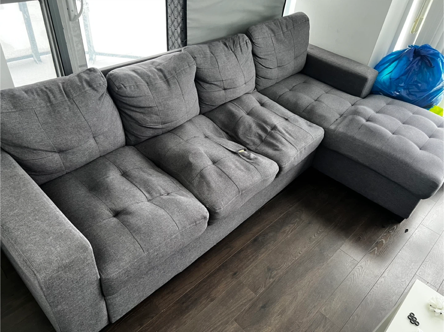This is a grey sectional sofa. It's upholstered in a durable fabric with tufted seat cushions. There's some minor wear on the seat cushion and springs