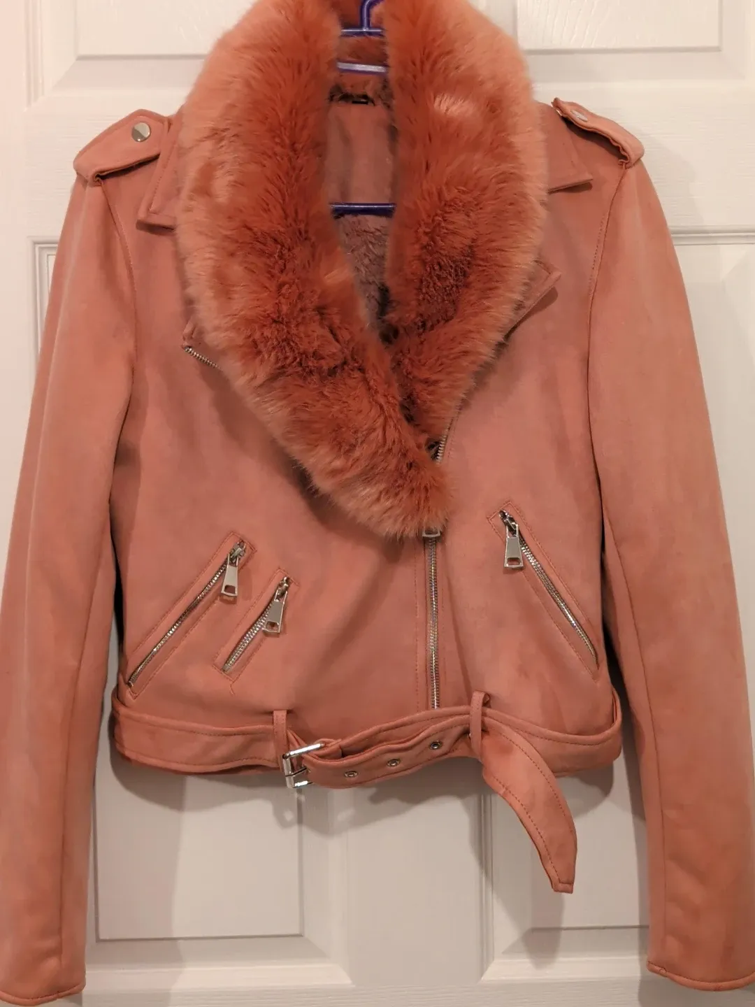 Pink Faux Suede Moto Jacket with Fur Collar