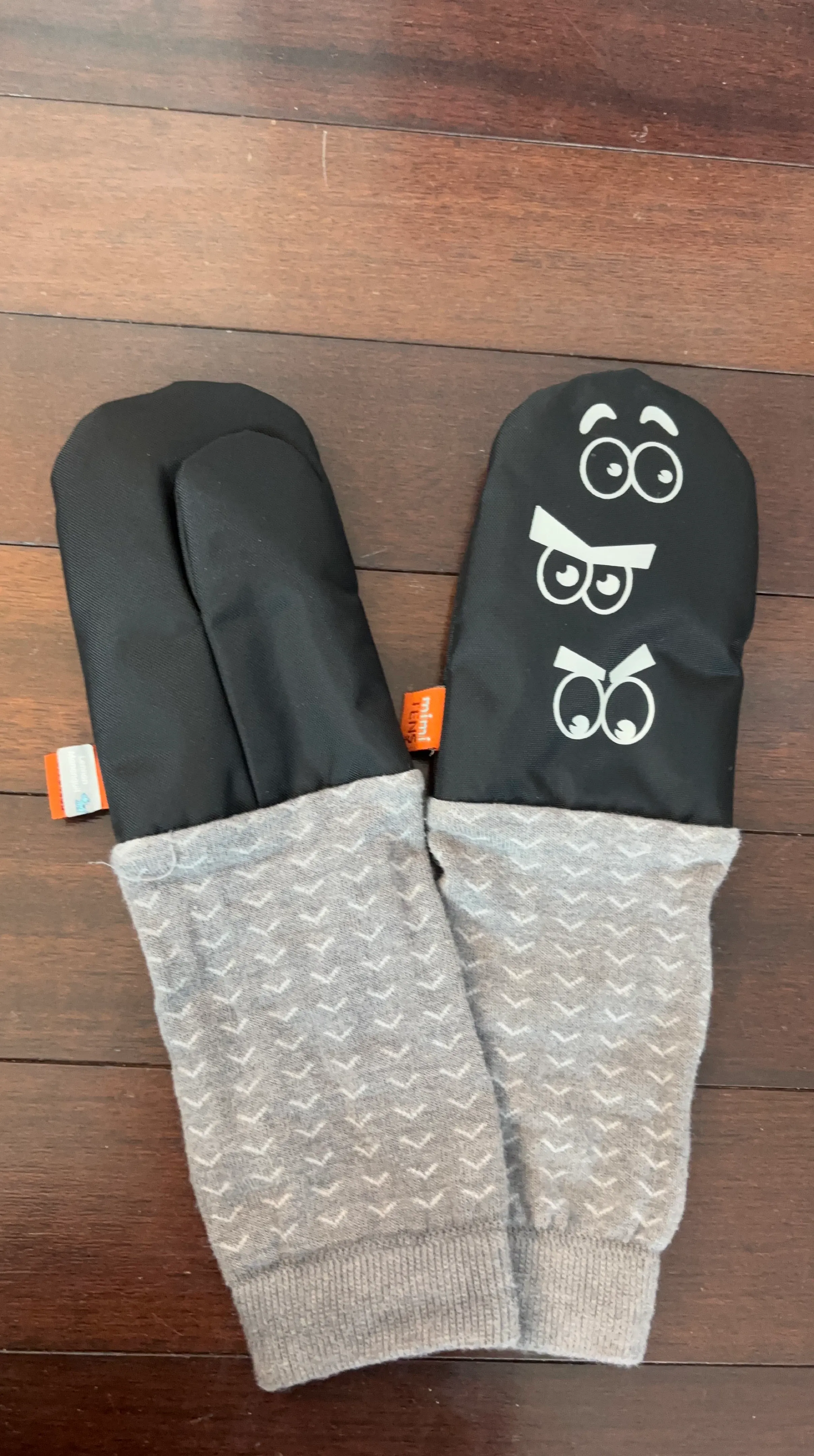 These Mimi & Tenz mittens are black with fun, cartoonish faces. They feature a grey, patterned cuff with grippy details. Great for keeping little hands warm!