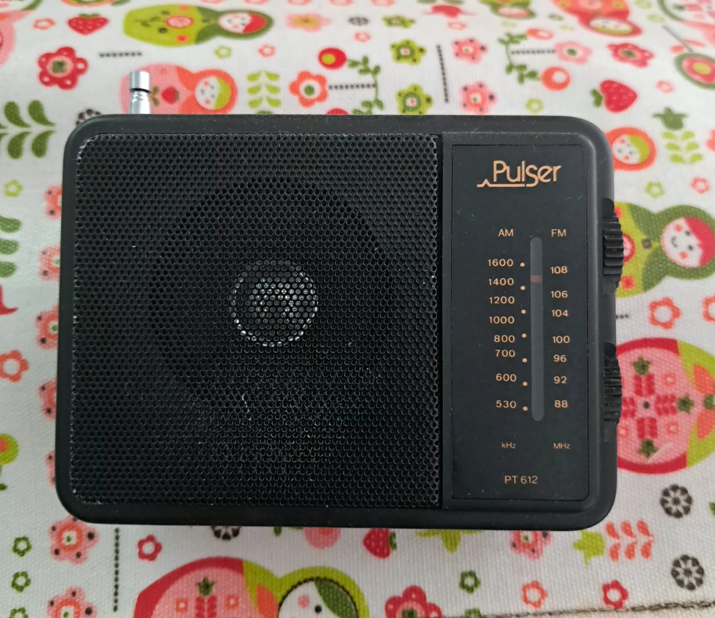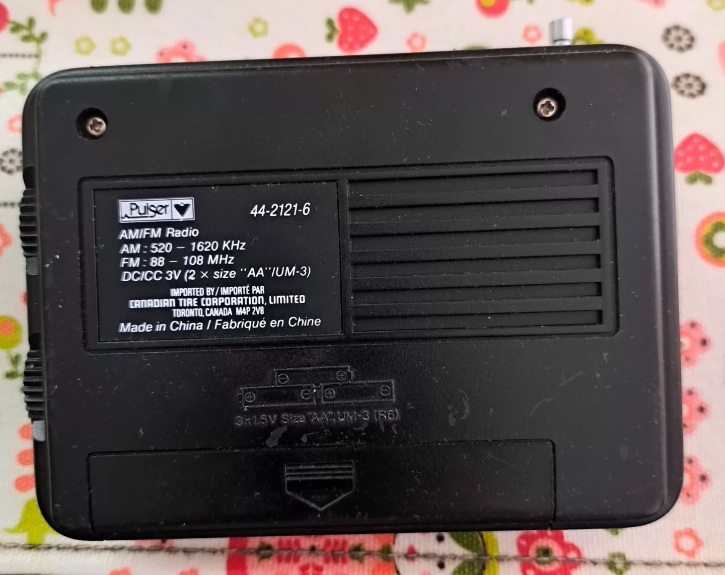 This is a vintage Pulser PT612 AM/FM radio. It runs on 2 x AA (UM-3) batteries. Imported by Canadian Tire Corporation, Limited. (Batteries are not included)